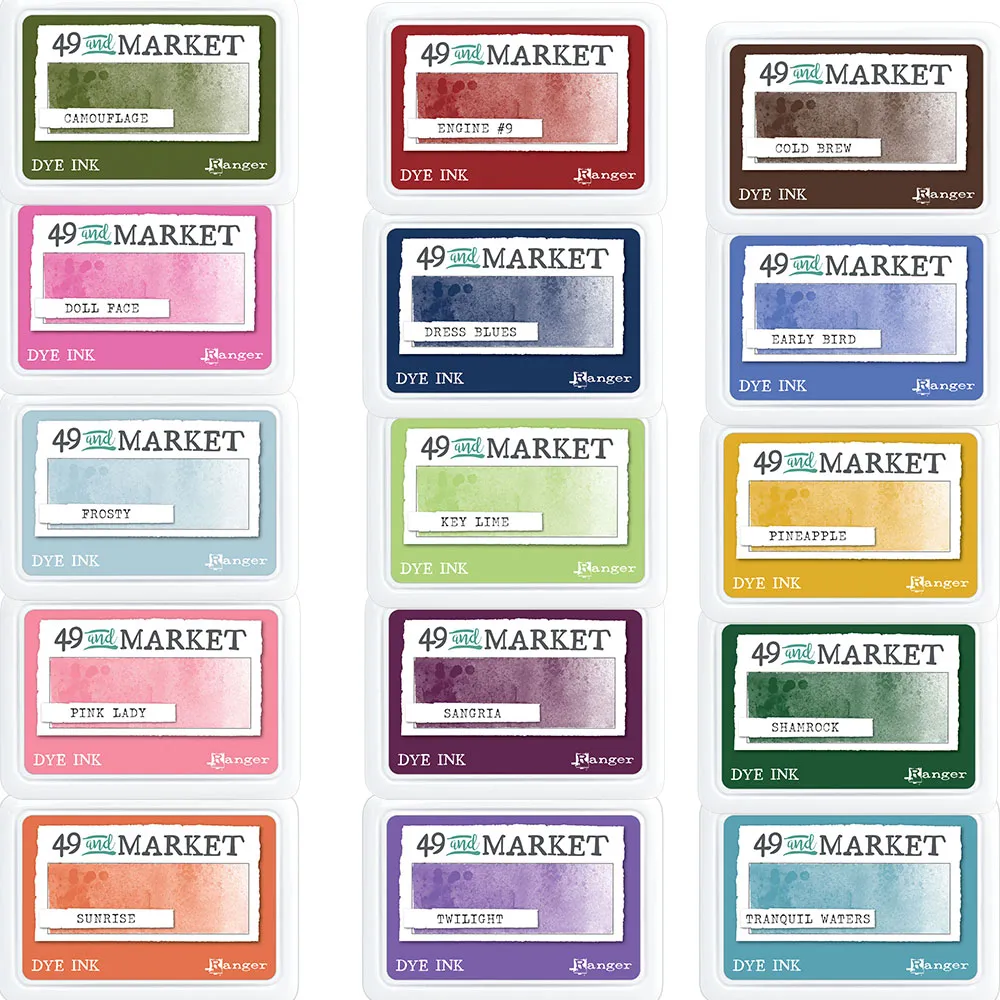 Unlock endless creative possibilities with 49 and Market's highly pigmented dye ink. Achieve seamless blends and stunning layered effects thanks to its exceptional bendability. Formulated to mix beautifully with water while maintaining full color integrity. This ink is a fantastic choice for stamping as well! Perfectly matched hues designed to coordinate with papers, embellishments, and more across the 49 and Market collections. This bundle contains all fifteen colours released in January 2026 : Camouflage, Cold Brew, Doll Face, Dress Blues, EArly Bird, Engine #9, Frosty, Key Lime, Pineapple, Pink Lady, Sangria, Shamrock, Sunrise, Tranquil Waters and Twilight.
