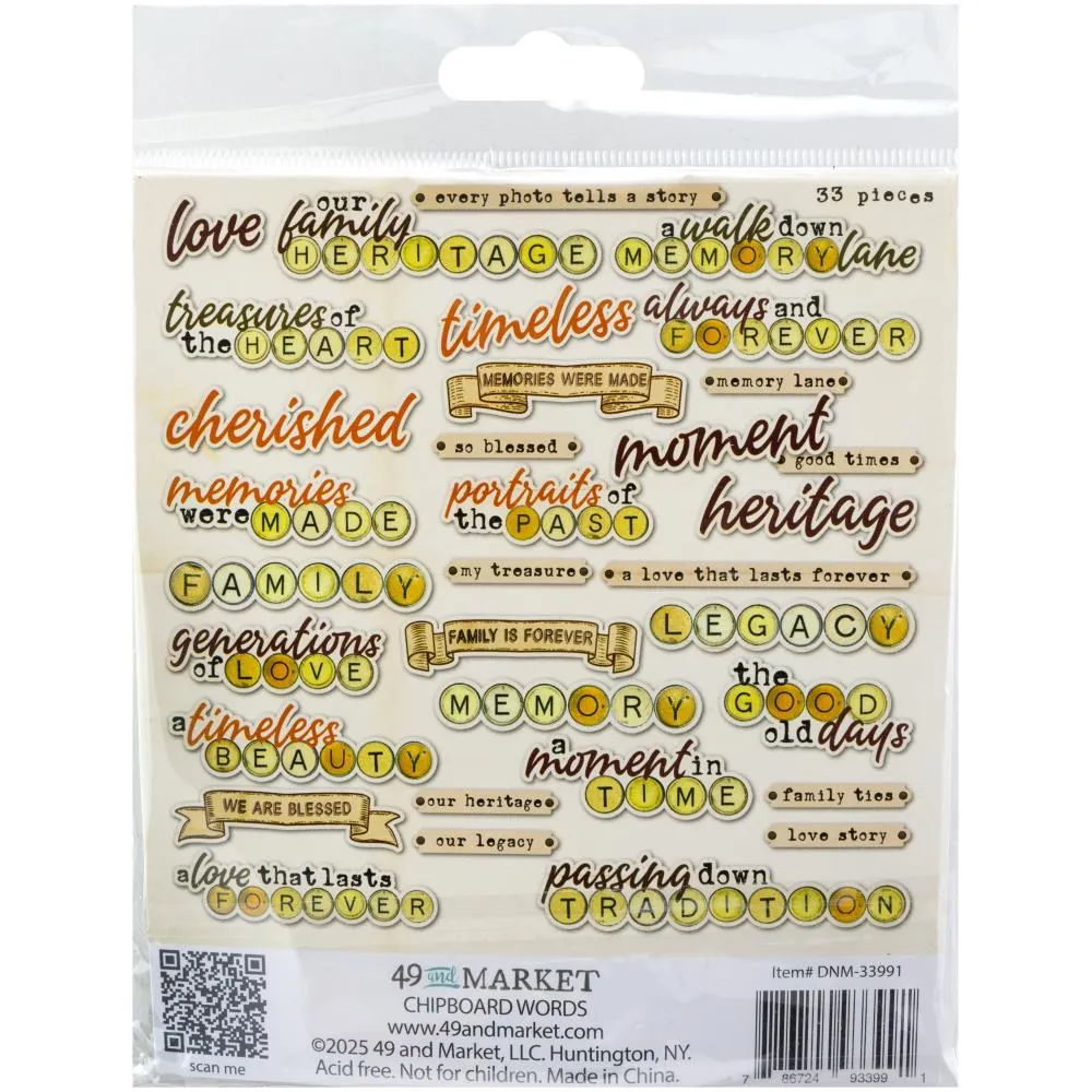 Dennis Bruton's Nostalgic Memories Chipboard Words are the perfect addition to your vintage-inspired crafts. Dive into the past with word strips and phrases of times gone by, featuring classic designs like typewriter keys and stylish banner elements. Give your projects an authentic, sentimental touch!