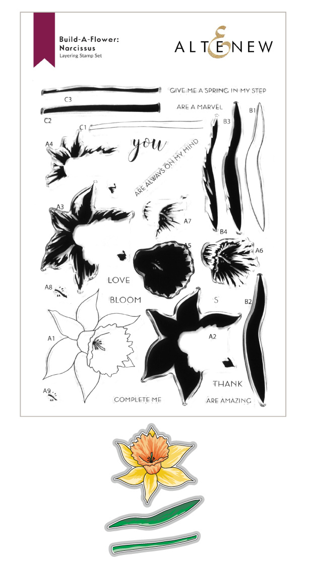 The Build-A-Flower: Narcissus special edition stamp and die set is only sold as a bundle. It includes one 6" x 8" clear photopolymer stamp set (26 individual stamp images) and one coordinating die set (3 dies).