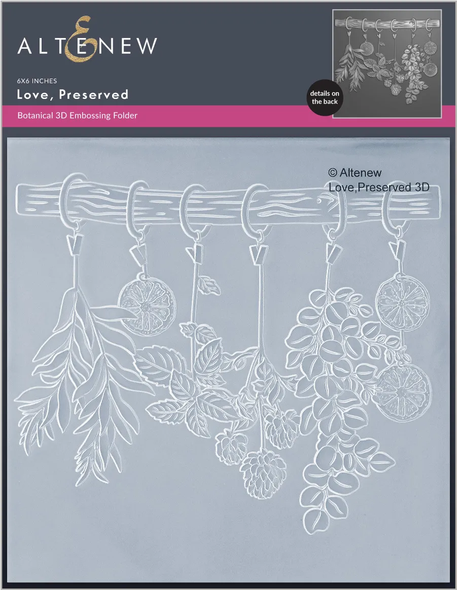 Infuse your projects with the quiet romance of dried herbs and citrus. The Love, Preserved 3D Embossing Folder features a hanging array of rosemary, mint, clover, eucalyptus, and orange slices—tied with twine, clipped with care, and steeped in nostalgia. Whether you're crafting cards, memory journals, or seasonal scrapbooks, this design brings warmth, stillness, and a touch of rustic poetry to every page.