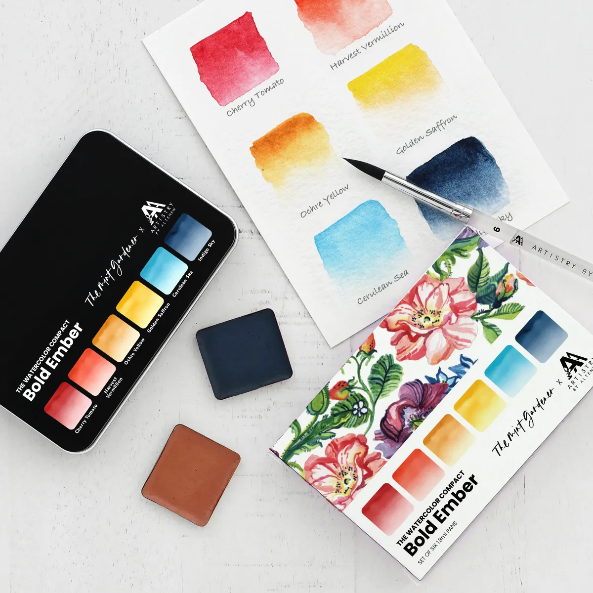 Unleash fiery creativity with the Bold Ember Watercolor Compact Set, a six-color watercolor set featuring glowing reds, radiant yellows, and deep, moody blues.