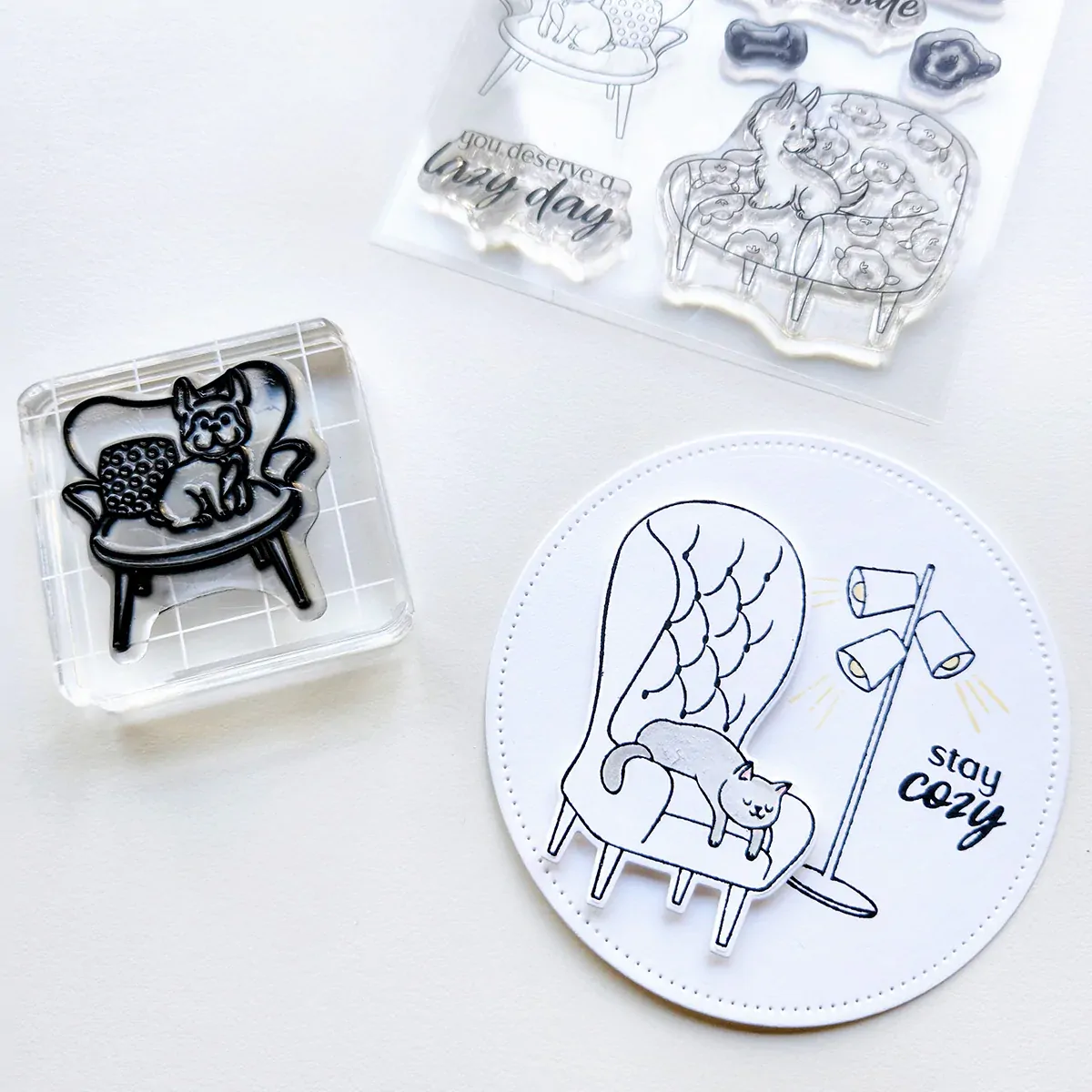 The Cozy Pets Stamp Set features three adorable line-art stamps of cozy chairs with cats and dogs curled up, keeping your spot warm. Color them with your favorite markers or mediums to create charming focal-point images. The set also includes a modern lamp and a few cute accents to complete each scene. Perfect for sending a “deserves a lazy day” card, these stamps pair beautifully with the coordinating Cozy Pets dies to add dimension to your cards or scrapbook pages.