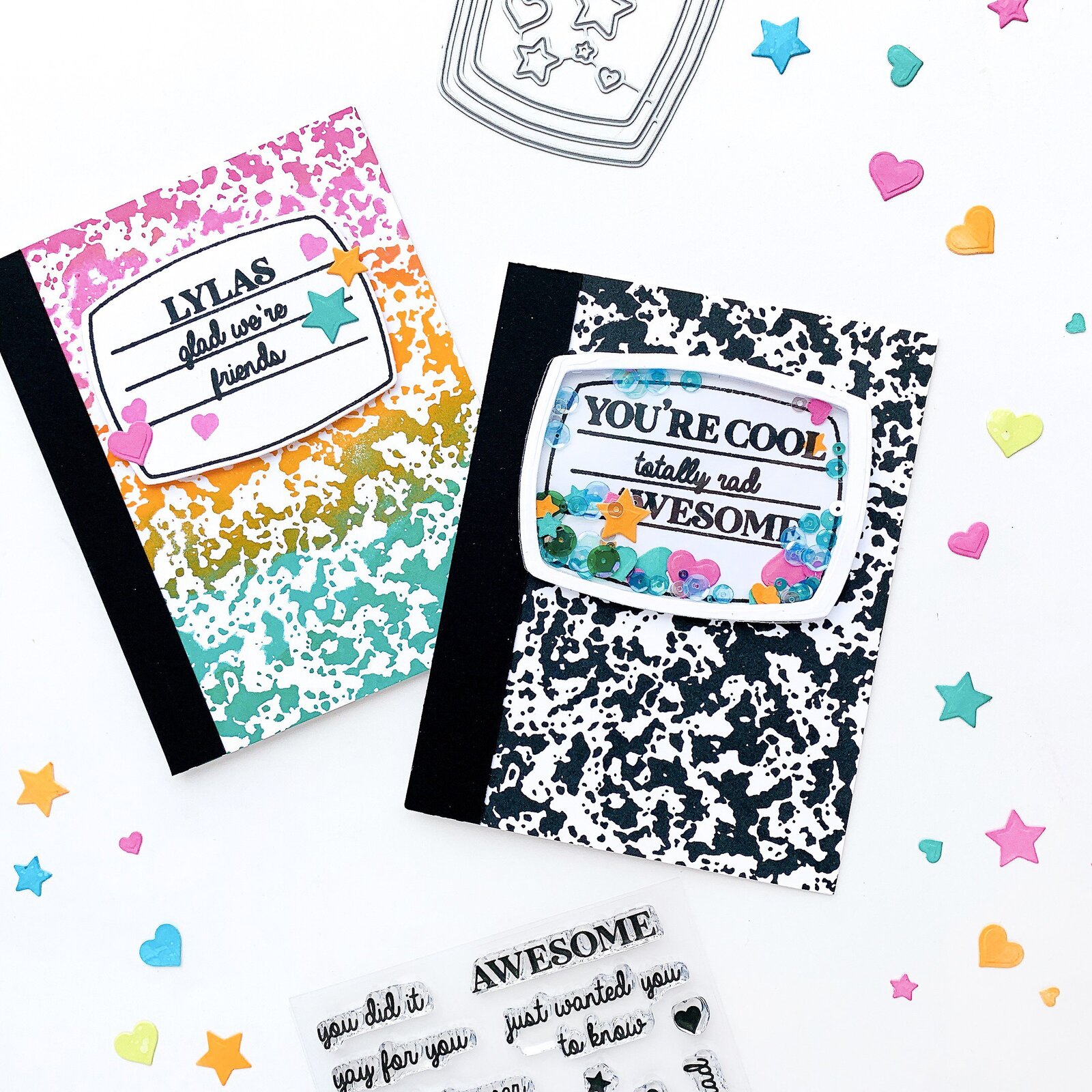 The Composition Label Dies were designed to pair with the Composition Sentiments Stamp Set. Beyond the basic of just cutting the label for the front of your card, this set of dies was made for shakers! Little heart and star dies are paired up with this set to allow you to cut fun confetti for your shaker cards. The nesting dies give you room for creating layers for shaker card ease. Use the layers of the Composition Label Dies with the coordinating Composition Sentiments Stamp Set to add the perfect label to you Composition Notebook Background Stamp. Illustrated by Leslie Dunegan Stainless steel and are compatible with all standard die cutting machines.