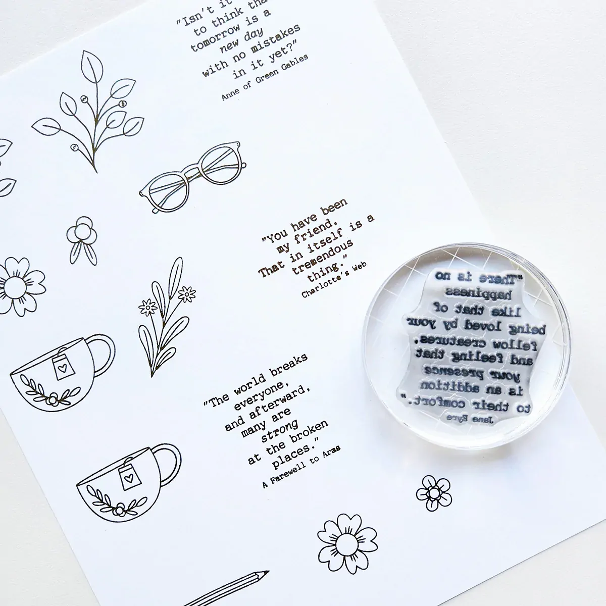Straight from the pages of classics like Anne of Green Gables and Northanger Abbey, the Excerpts Sentiments 6x8 Stamp Set is filled with beautiful book quotes about life and friendship. Line-art images of a tea mug, glasses, a pencil, and delicate floral accents make this set perfect for creating charming cards—just add the coordinating Excerpts dies!