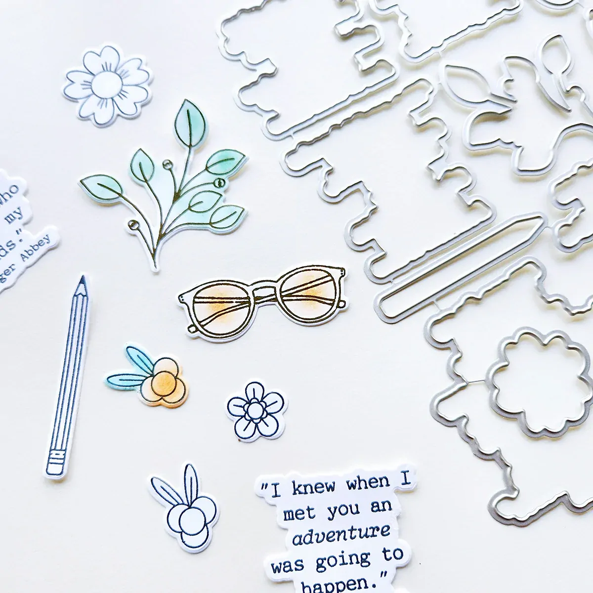 The Excerpts Sentiments Dies are designed to perfectly coordinate with the Excerpts Sentiments Stamp Set, making it easy to cut out your stamped images and phrases with precision. Featuring classic book quotes and literary-inspired sentiments, these dies add a thoughtful touch to cards, journals, and scrapbook spreads. You’ll also find coordinating dies for the playful accent images—like glasses, a pencil, and a cozy mug of tea—perfect for layering and adding charming details to your projects.