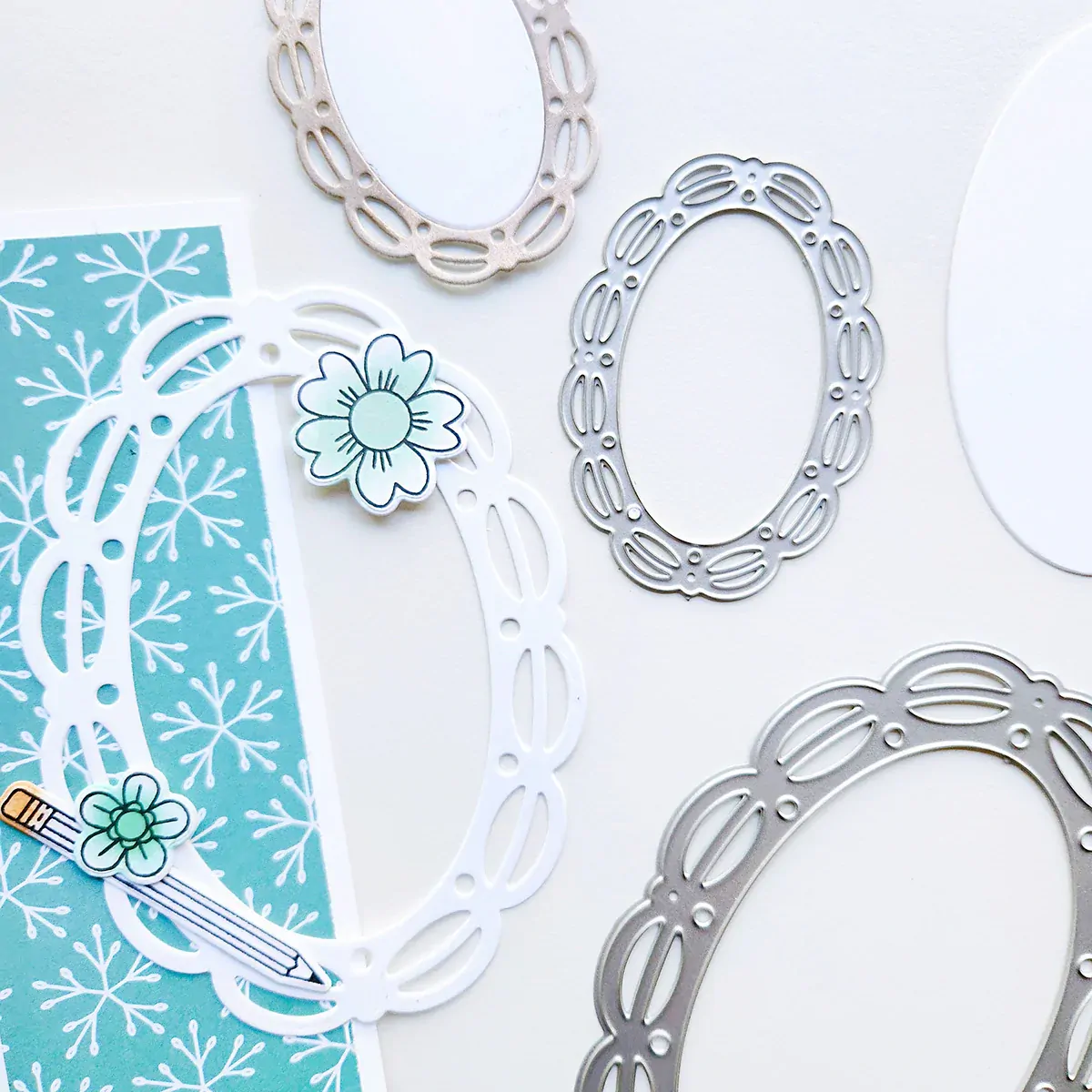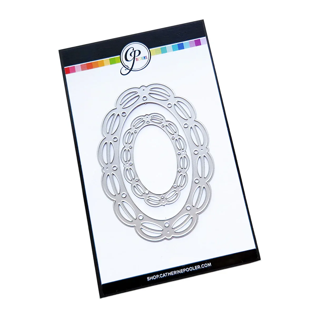 The Gilded Oval Dies include a pair of elegant oval frames that make the perfect focal point for your cards and projects. With a delicate cut-out scalloped design, these dies add a charming touch and bring a polished finish to any layout. Ideal for framing stamped images, sentiments, or layered accents, they’re a versatile addition to your crafting collection.
