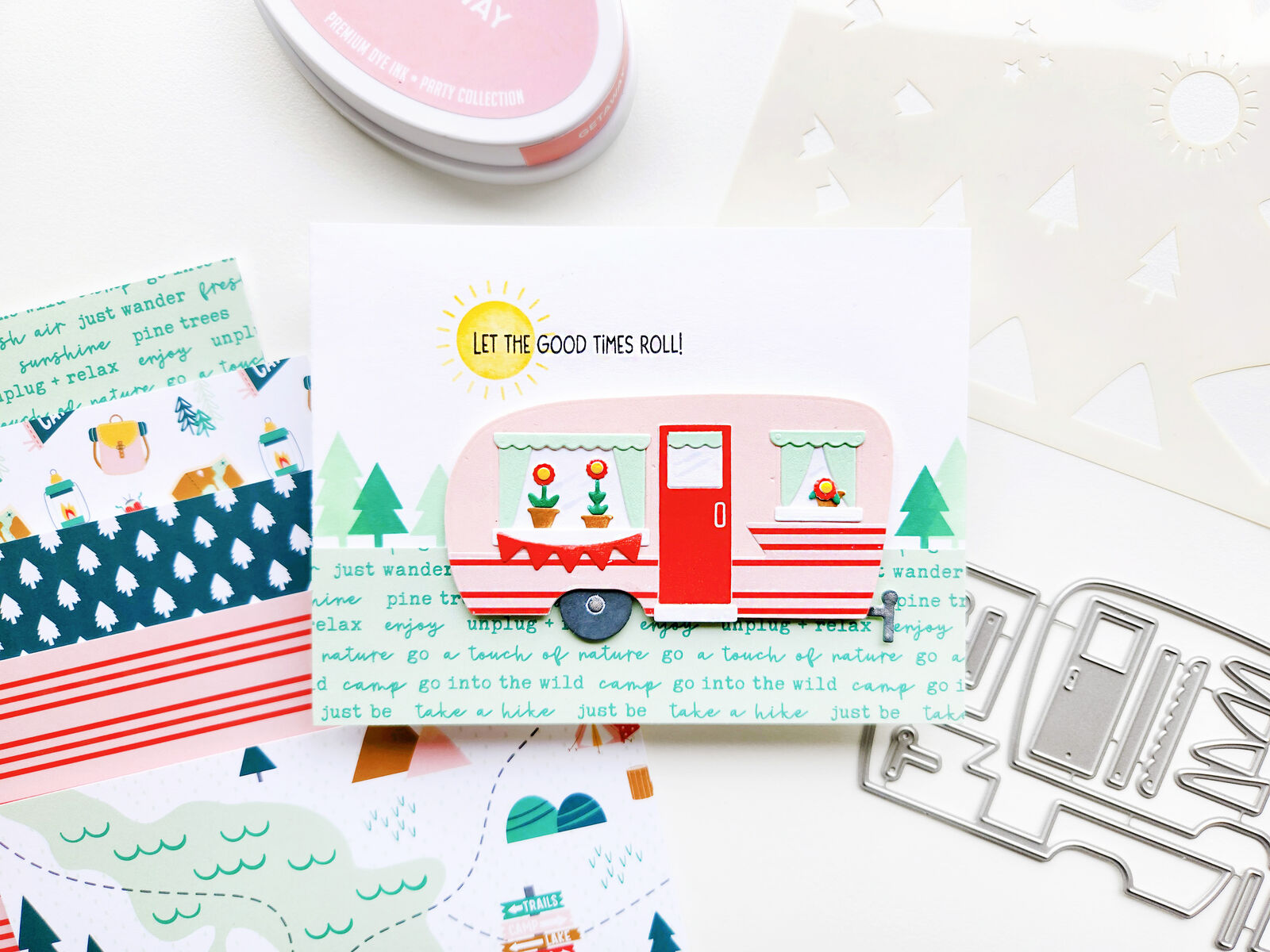 Build your own custom vintage camper with the dies, fill it with potted flowers, and mix and match colors or patterned paper for a playful look. Add fun one-line sentiments to celebrate rest, friendship, adventures, and more. Finish your creations with the camp-inspired patterned papers featuring trails, trees, fireflies, and logs in a vibrant color palette.