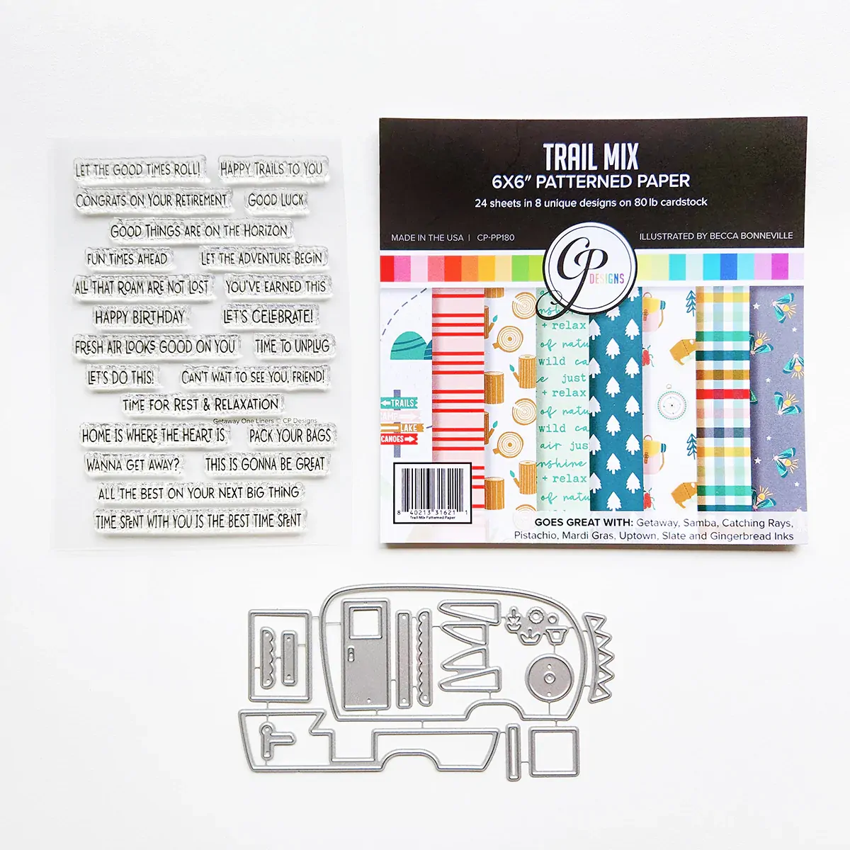 Everything you need for cozy, creative camping scenes comes in the Glamper Life Bundle. This set includes the Glamper Life Dies, Getaway One Liner Sentiment Stamp Set, and Trail Mix Patterned Paper.