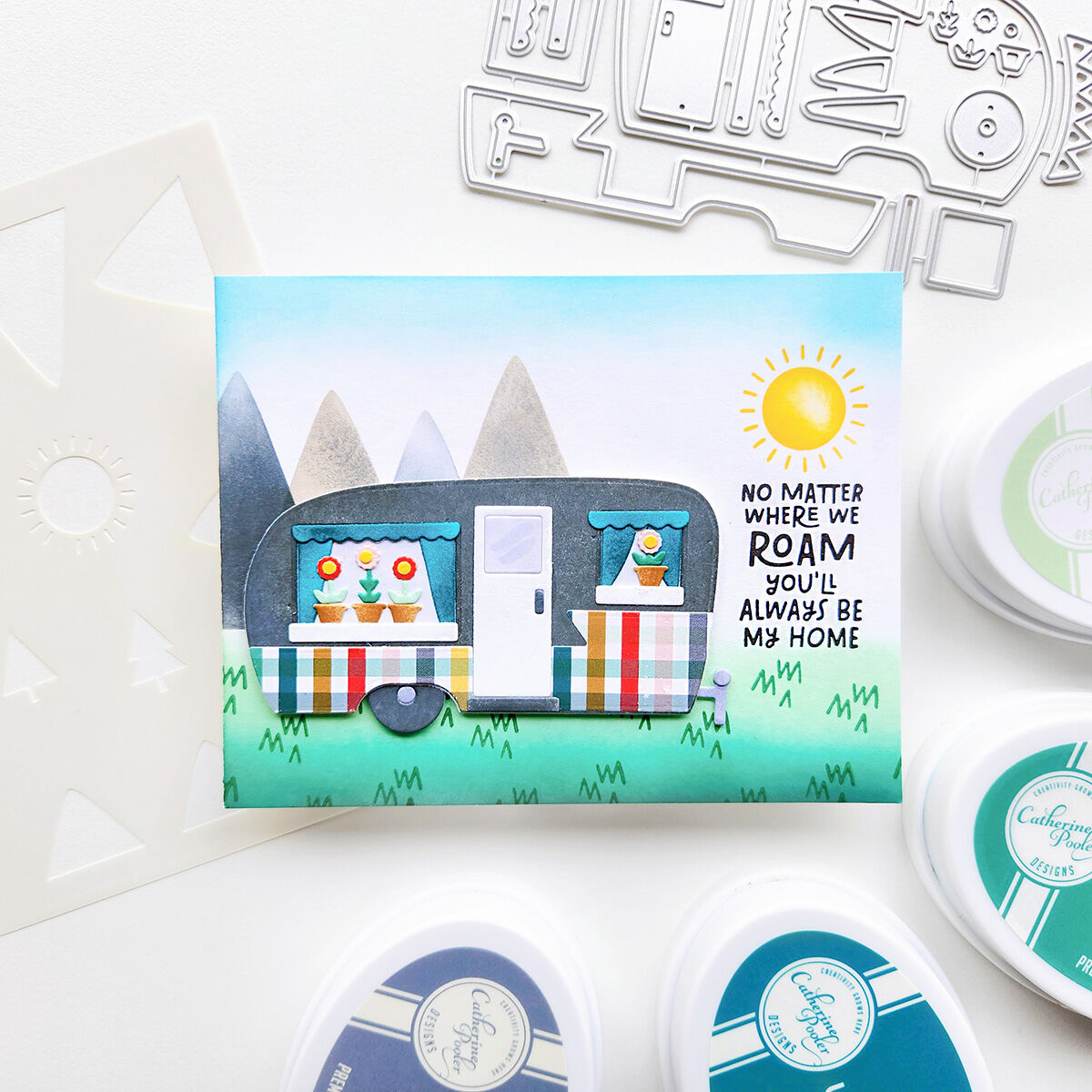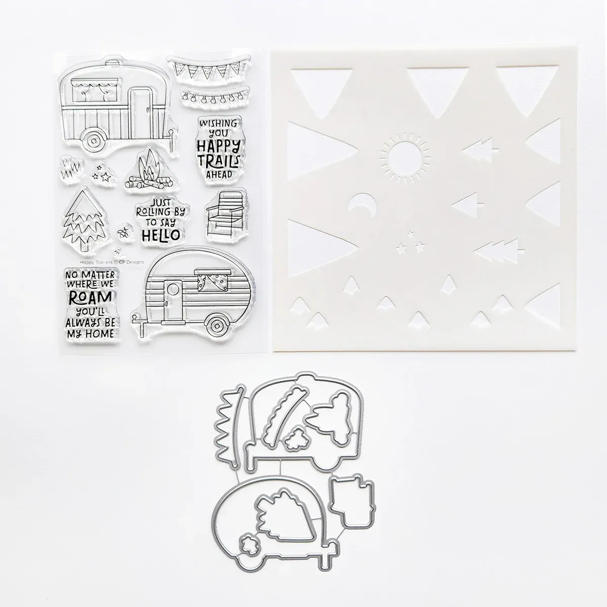 Build cozy scenes with retro trailers, twinkling lights, cheerful bunting, and comfy lawn chairs. Layer in mountains, snowcaps, sun or moon, stars, and evergreen trees with the stencil to create the perfect backdrop. The coordinating dies make cutting each piece easy, so scene-building is a breeze.