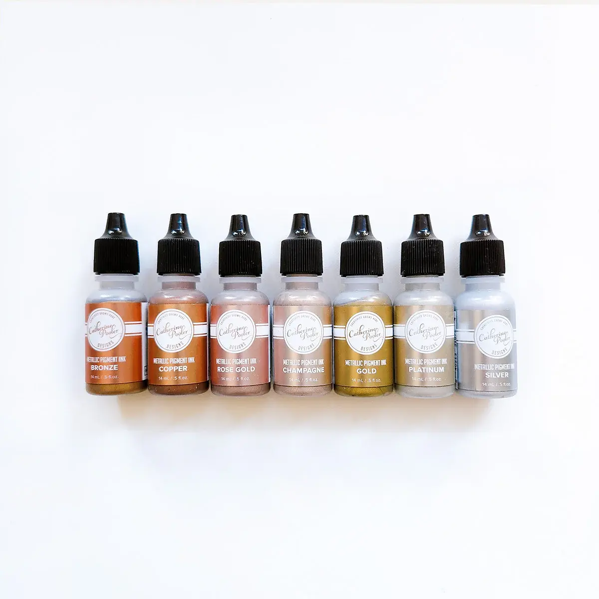 This bundle will bring Rose Gold, Champagne ,Gold, Platinum, Silver, Bronze and Copper metallic options to your inky collection!