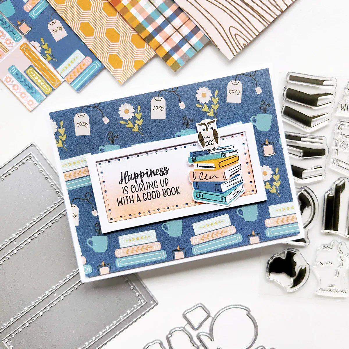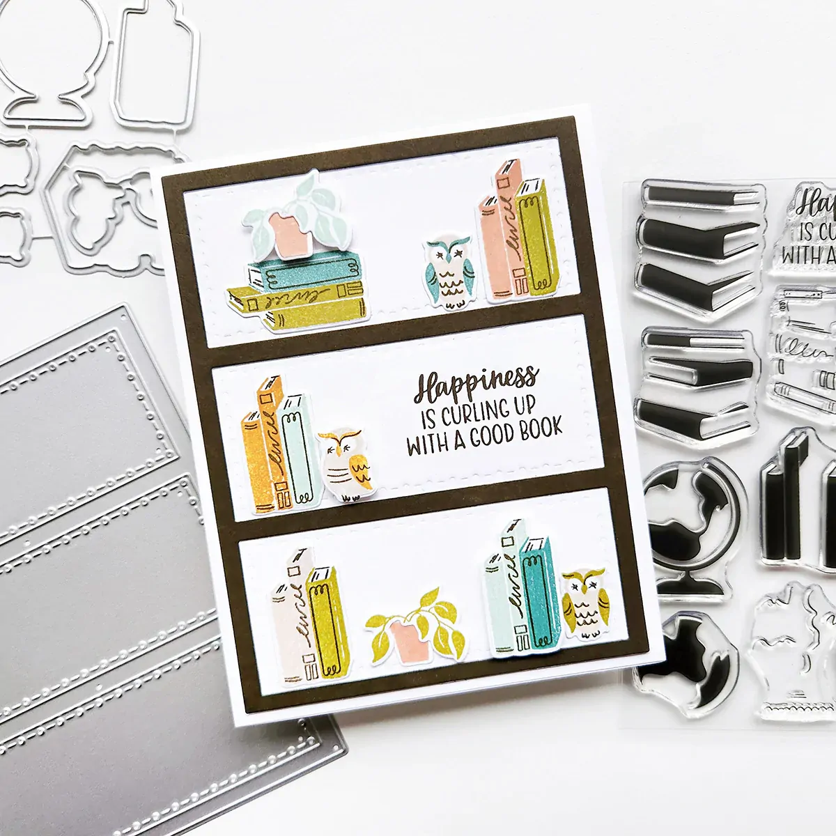 In StockThis versatile On the Shelf Cover Plate Die does double duty! Cut a charming bookshelf frame for your card front and fill each shelf with stamped and die-cut images from sets like the Good Book Stamps & Dies to create a curated, storybook-worthy scene.