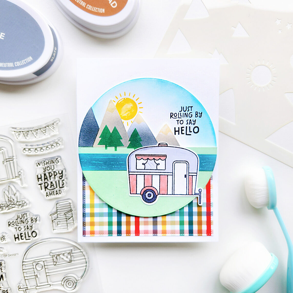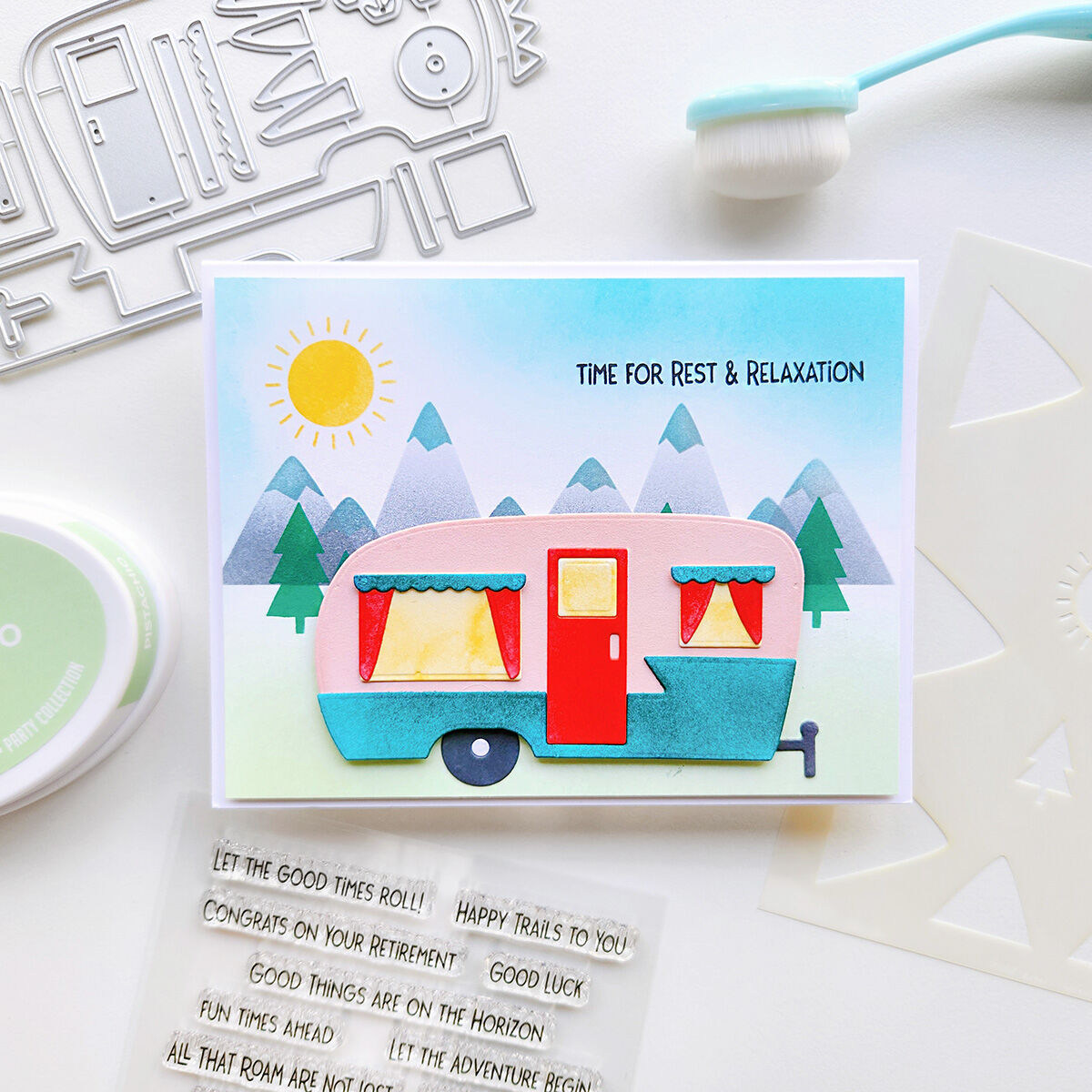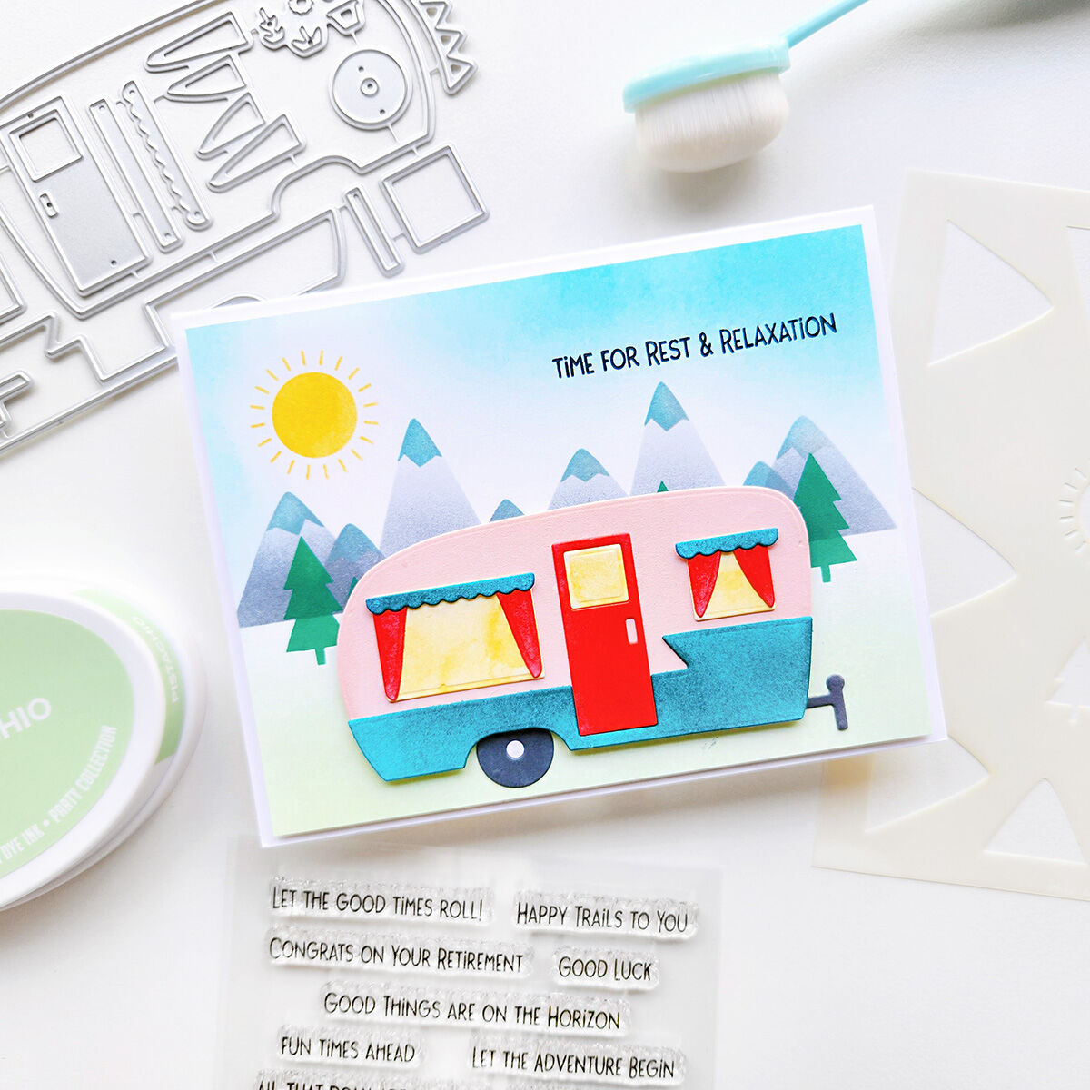 This stencil makes a beautiful background for cards featuring the Happy Trail-ers Stamp Set. or Glamper Life Dies, or use it alone to create a peaceful, scenic mountainscape card.