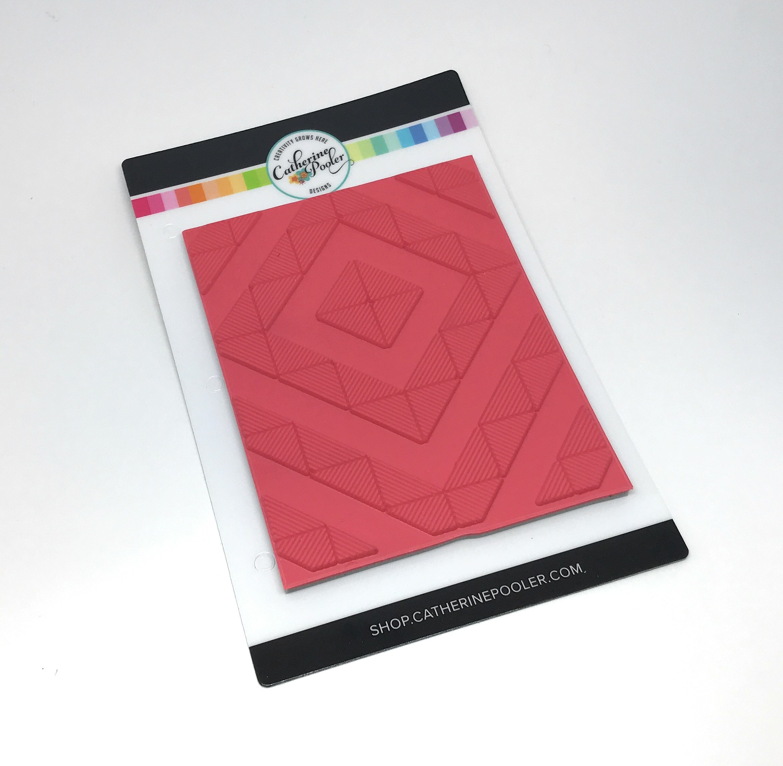 Geometric patterns take a fun turn with an angled square design made up of striped triangles! Use this offset design as a focal image or fabulous supporting piece to your project. Emboss this great design over colored cardstock or use your favorite medium for a colorful technique piece for your cards. Background measures 4-3/8 x 5-5/8. Pair up with any of our Word Dies for a quick stunning card. Illustrated by Shawna Clingerman Catherine Pooler Designs Cling stamps are made of high quality red rubber.