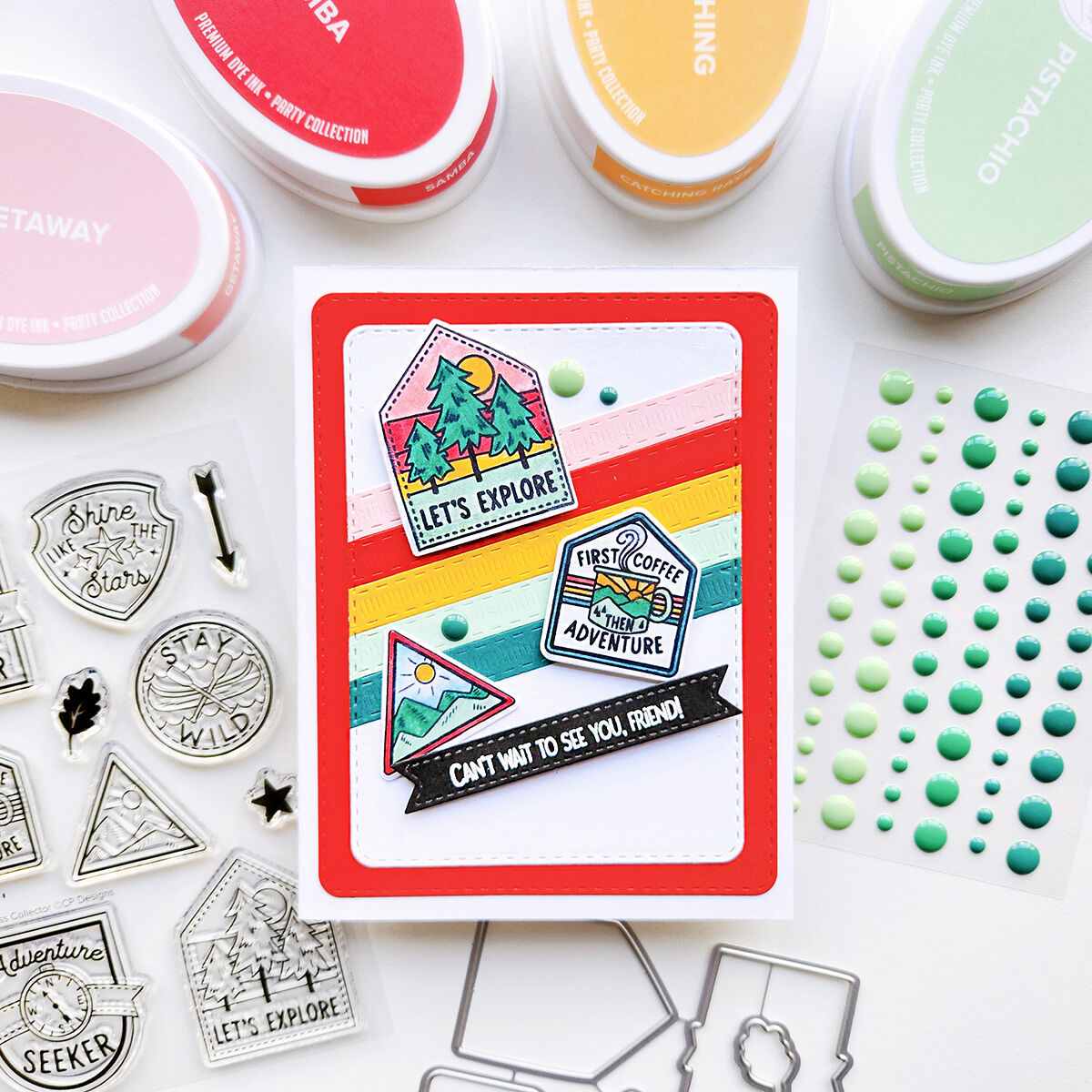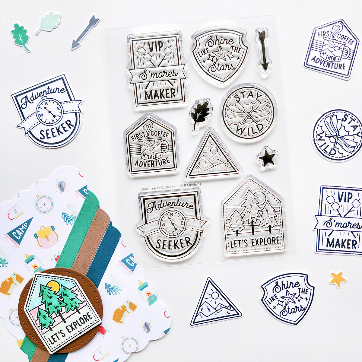 Send a card or decorate your scrapbook spreads with the Wilderness Collector Stamps and their coordinating dies. These cute camp badges celebrate the adventurous spirit, whether someone is an adventure seeker or a VIP s’mores maker. Inspired by scout badges with a whimsical twist, they are perfect for coloring in and using as the star of your card, or stamping them all in one color to create an outdoorsy background. Earn them all...no actual camping required!