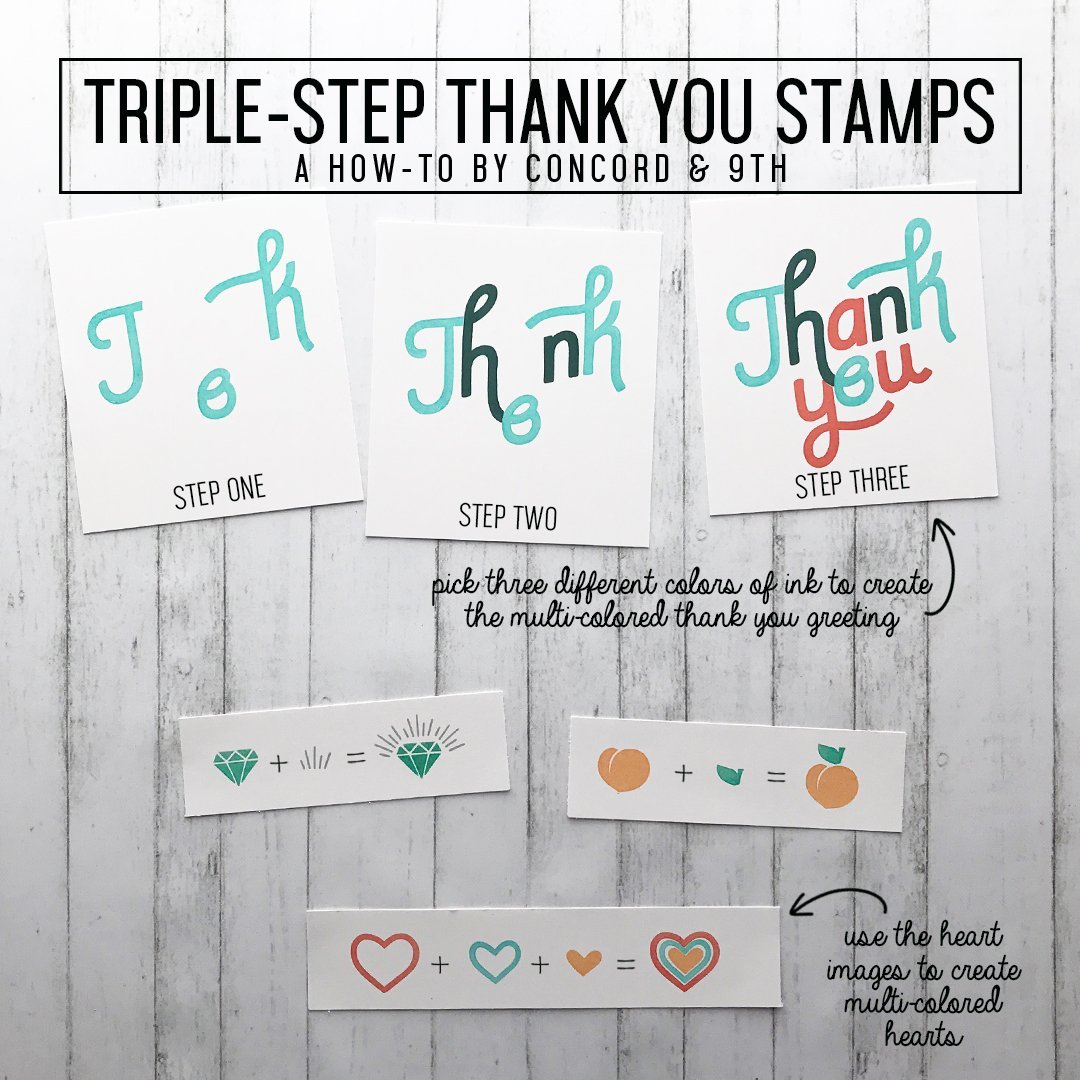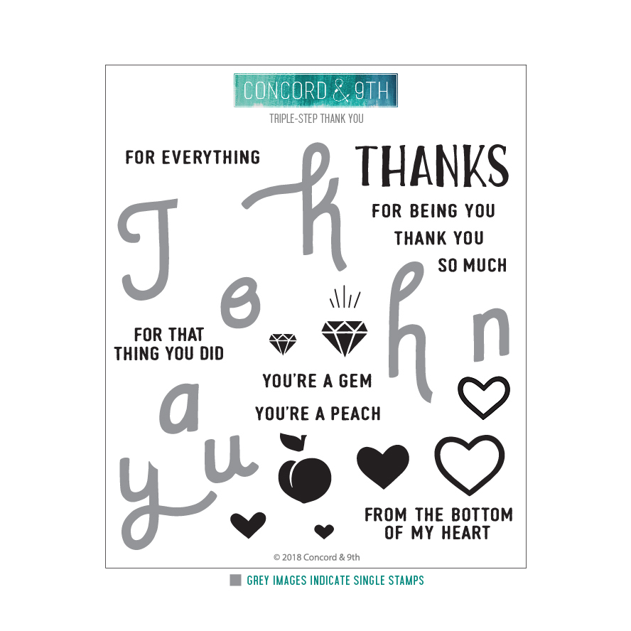6x6 stamp set with 22 pieces to help you say Thank You! Coordinates with the Triple-Step Thank You dies. This set works just like Triple-Step Hooray. It's called "triple-step" because the word Thank You is made up of 3 different stamp images so that you can get a variety of colors in one word! Create cards and say thank you in many different ways with this fun set!