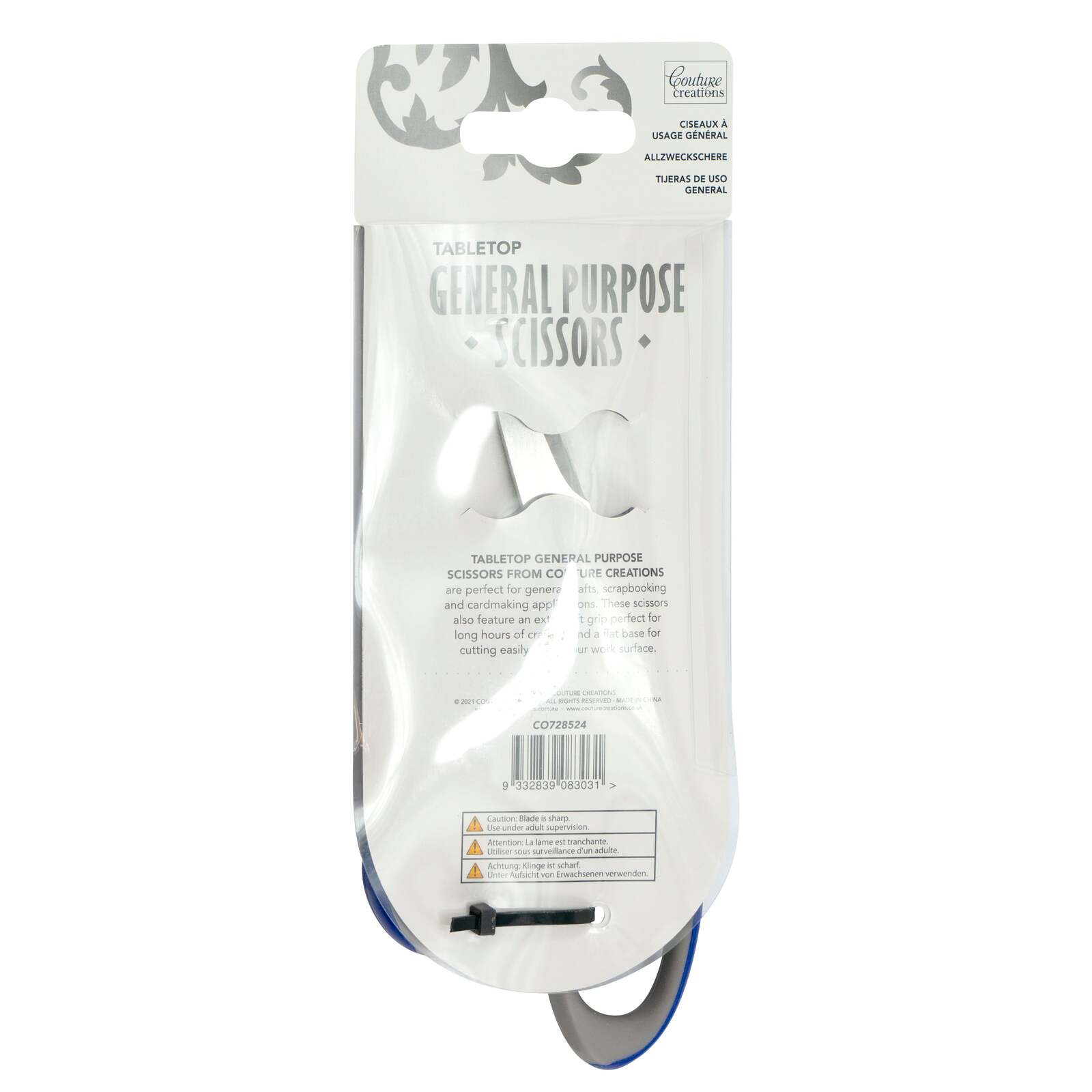 TABLETOP GENERAL PURPOSE SCISSORS FROM COUTURE CREATIONS are perfect for general crafts, scrapbooking and cardmaking applications. These scissors also feature an extra soft grip perfect for long hours of crafting and a flat base for cutting easily along your work surface. * 210mm | 8.2in Sharp Stainless Steel Blade. * Extra Large Soft Cushion Grip