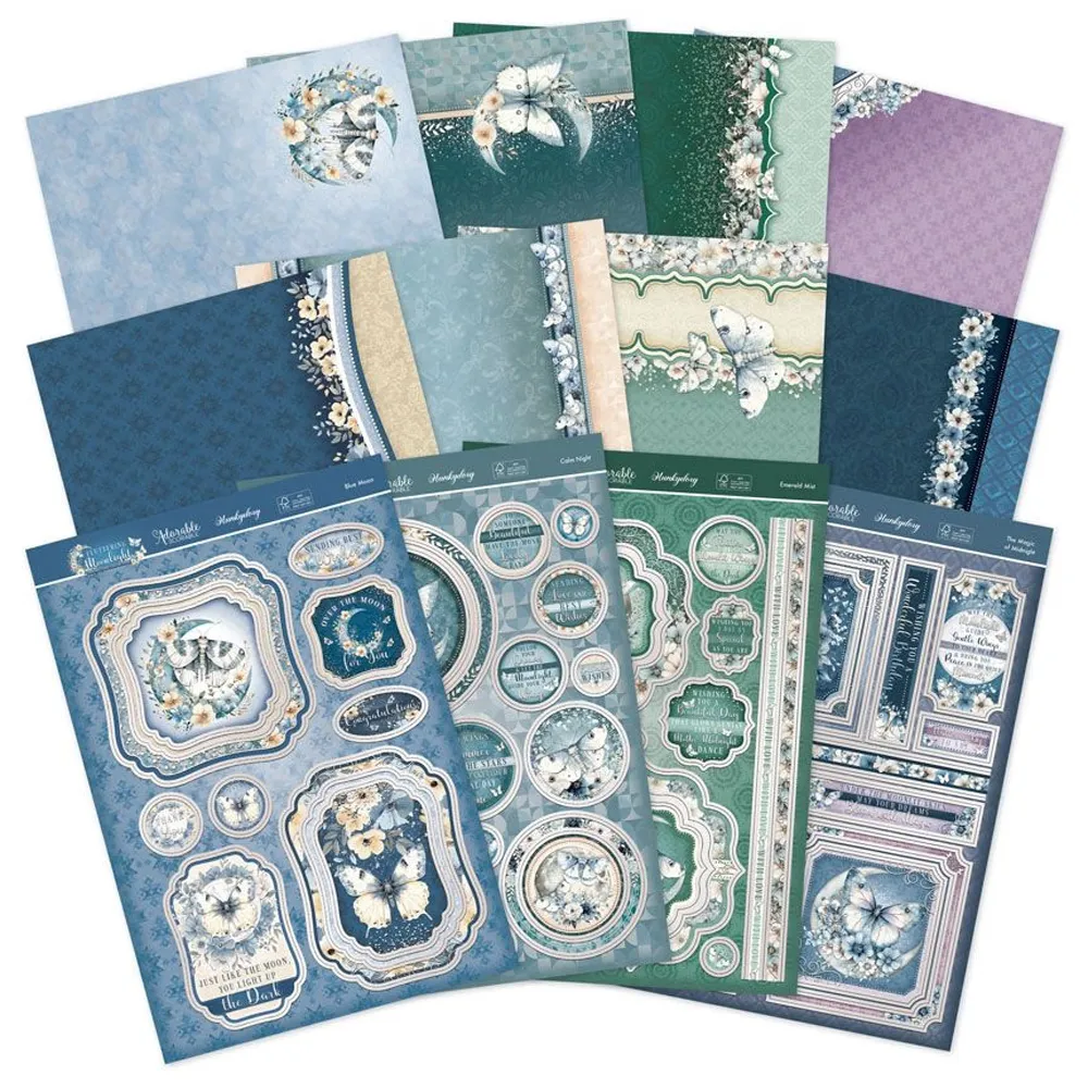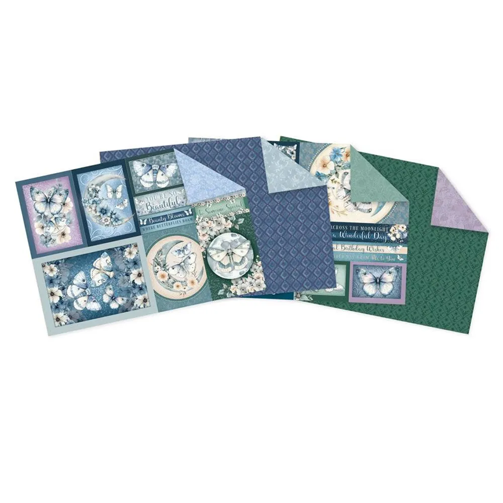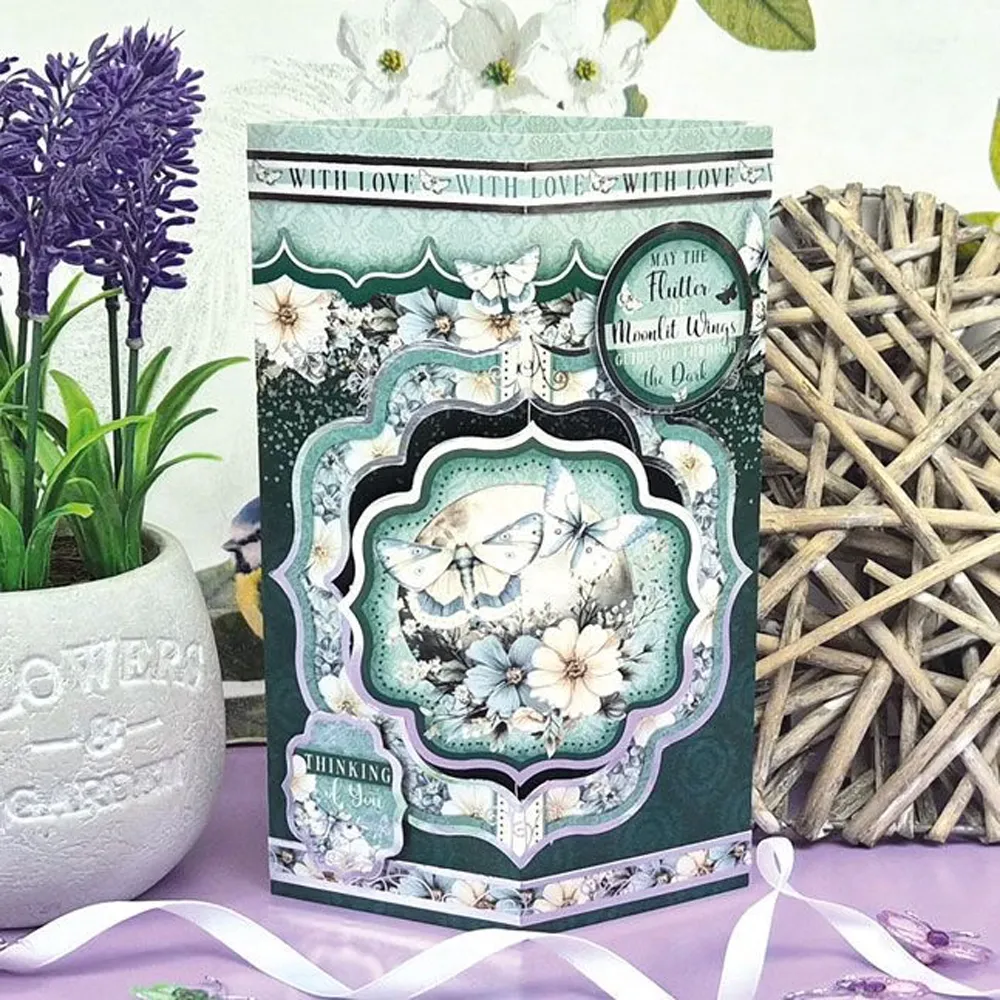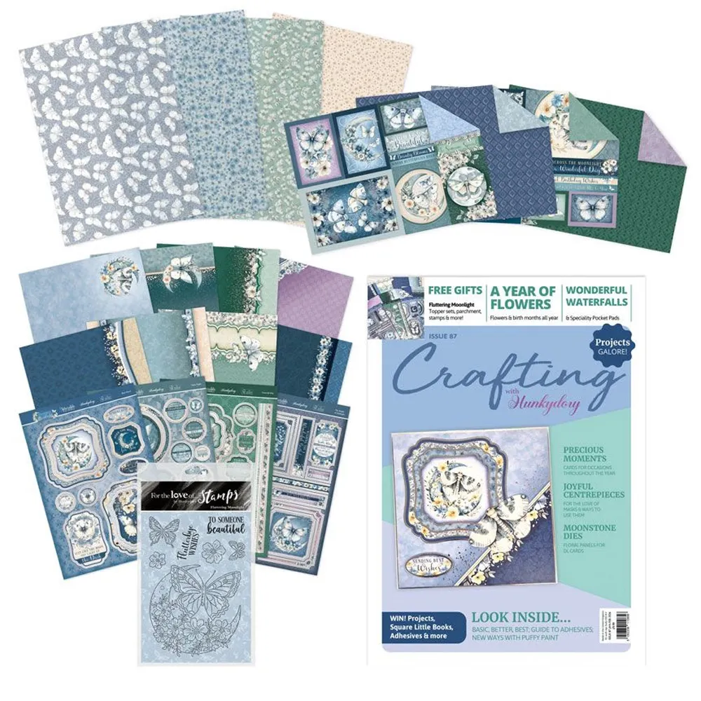 The 100-page magazine is accompanied by a fabulous range of Free Gifts, all under the umbrella of Fluttering Moonlight. There are 4 gorgeous Luxury Topper Sets with toppers showing butterflies and moths in moonlit surroundings, accompanied by accent-foiled cardstock and printed cardstock. Foiling is in Stunning Silver on Adorable Scorable cardstock for that luxury effect.