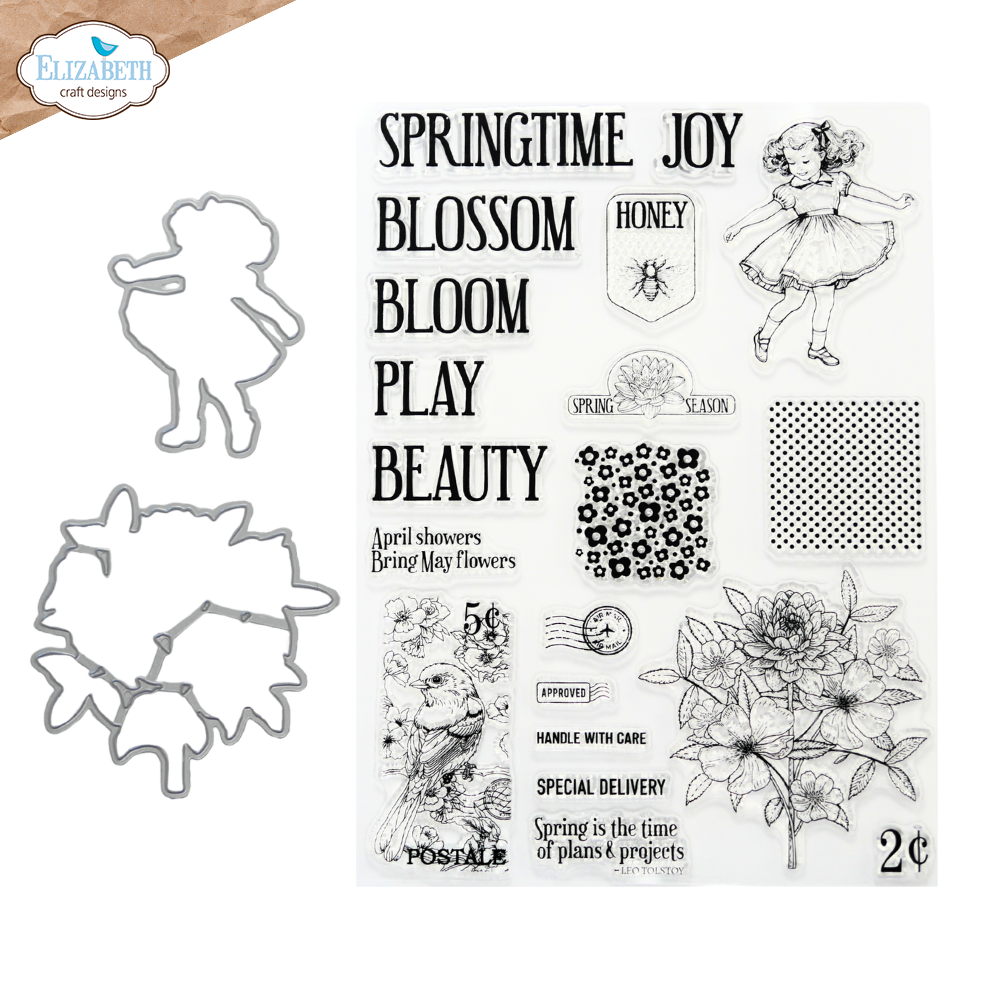 The Springtime Joy Stamp and Die Set is an A5 (6” x 8”) stamp set that includes 20 stamps and 2 thin metal dies; the largest die is approximately 3.31” x 3.3.7” (8.5 x 8.6 cm).