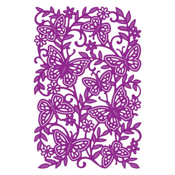 The Elegant Butterflies die creates a cloud of delicate and pretty butterflies, flying above intertwining foliage and flowers. Perfect for seasonal and feminine makes!