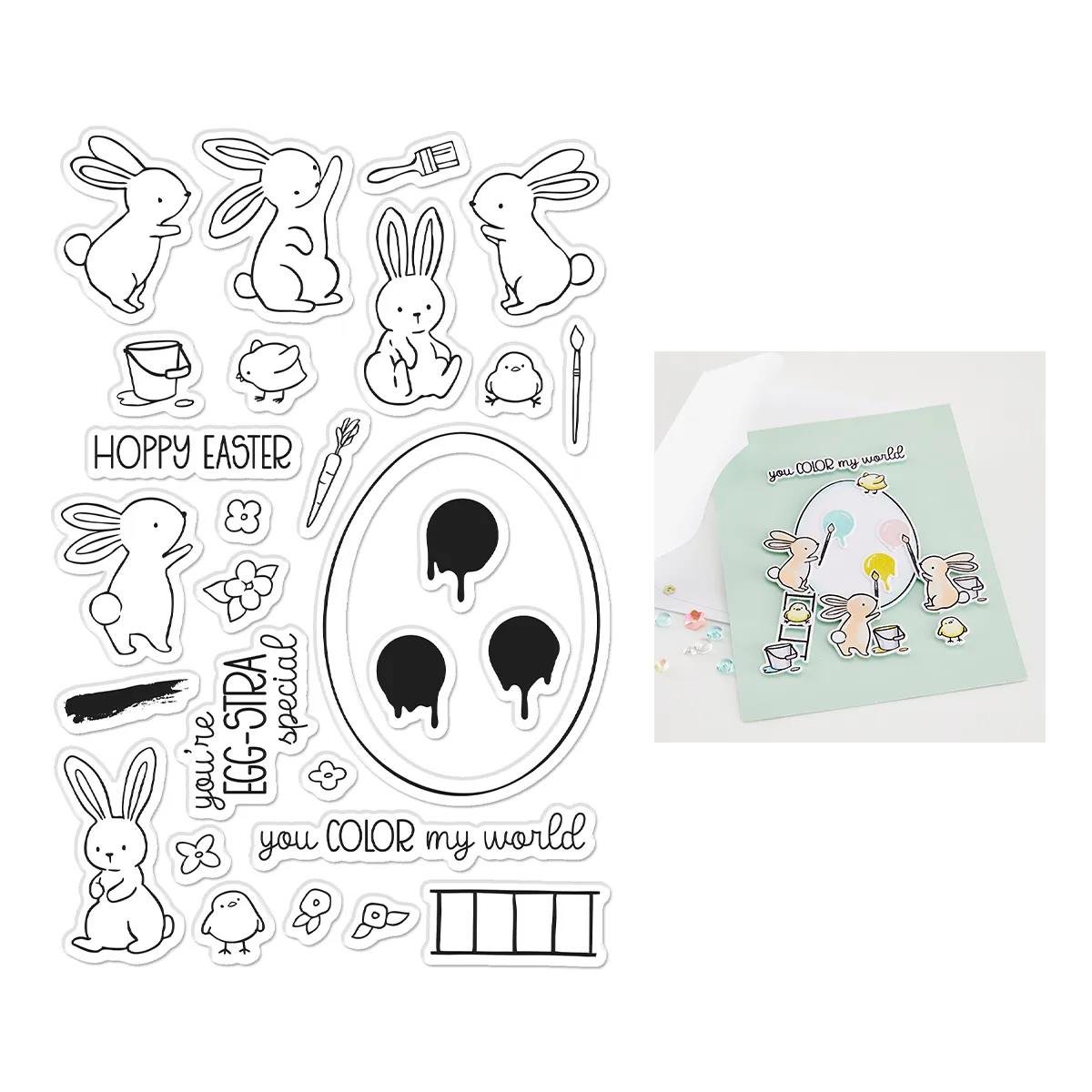 Sentiments include cheerful messages like ?Hoppy Easter,? ?You color my world,? and ?You?re egg-stra special.? Use the bunnies to paint, decorate, or admire the oversized egg for sweet Easter cards, or pair the images with the Easter Egg Infinity Dies for layered designs with extra impact.