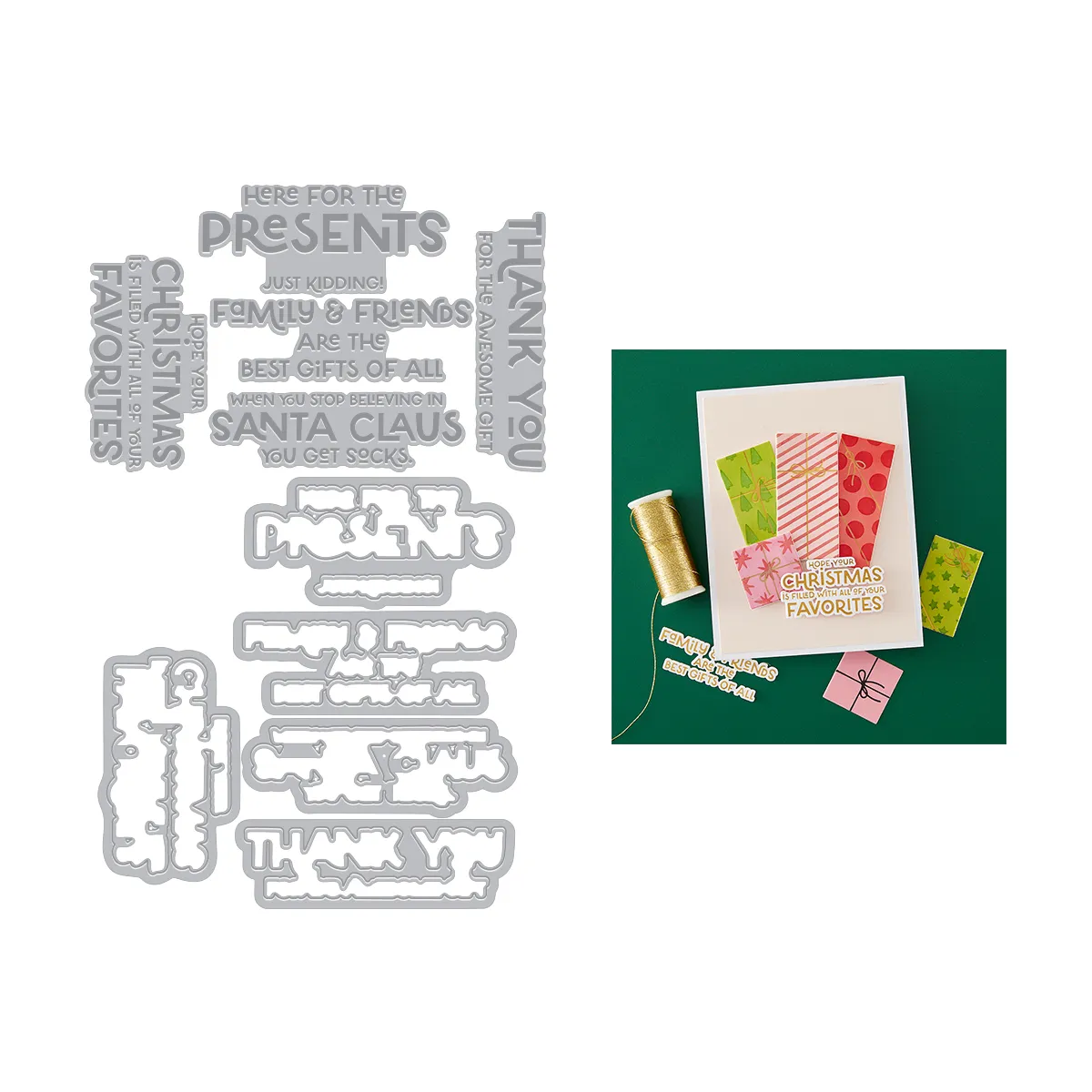 Here for the Presents Letterpress + Foil plates add a fun and festive twist to your holiday crafting. This set includes a collection of playful seasonal sentiments like ?Hope your Christmas is filled with all of your favorites,? ?When you stop believing in Santa Claus you get socks,? and the cheeky ?Here for the presents?just kidding!?