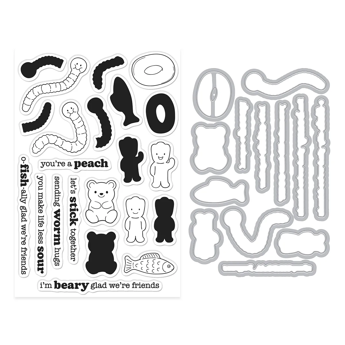 Create polished, playful cards with the Let?s Stick Together Stamp & Cut set. This set includes the Let?s Stick Together Clear Stamp Set along with coordinating metal dies that cut out the candy characters and sentiments with clean, crisp edges.