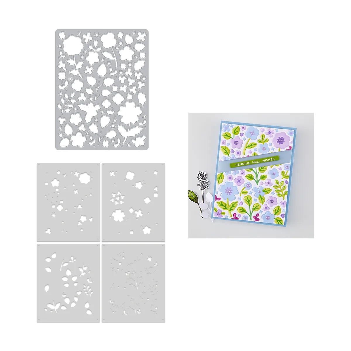 The Meadow Blooms Bundle includes the Meadow Blooms Cover Plate Die and the coordinating Color Layering Meadow Blooms Stencil, sold together for easy creativity.
