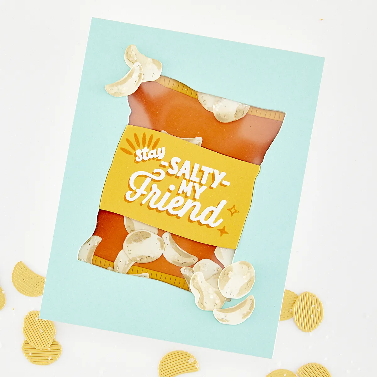 Add a fun twist to your cards with the Snack Attack Die Set. This set includes 11 metal dies that create a chip bag bursting with flavor and overflowing with chips. Pair it with the Chip Chip Hooray Clear Stamp Set for bold, playful sentiments that complete the look.