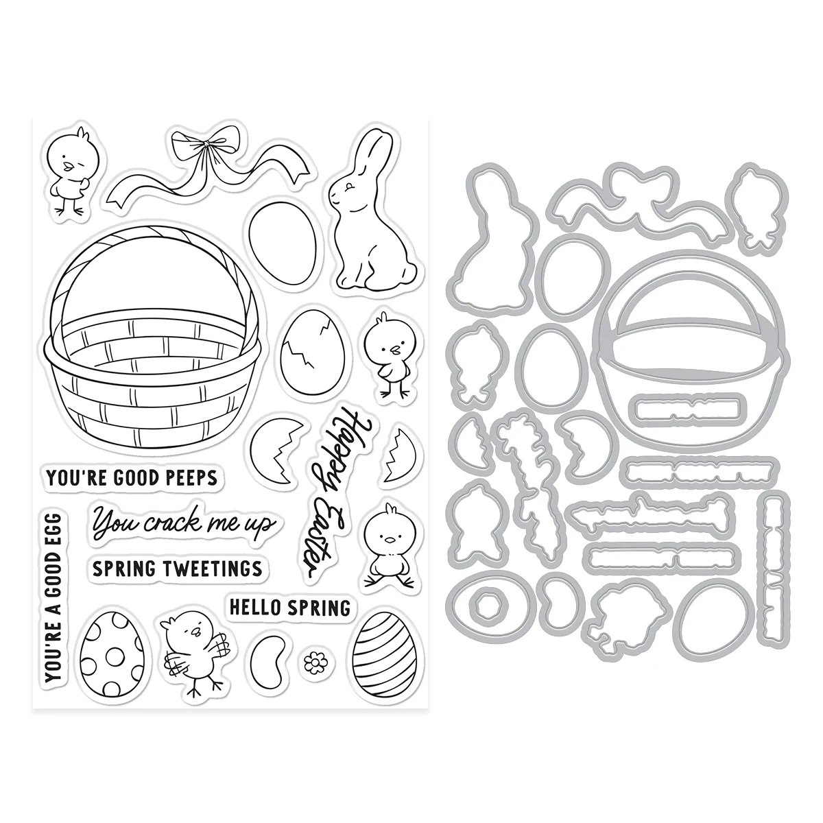 Sentiments include ?You?re good peeps,? ?You crack me up,? ?Spring Tweetings,? and ?Hello Spring.? The coordinating metal dies cut out each image with clean, crisp edges, making it easy to add dimension and create polished, professional-looking cards. Use the images to build simple focal points or fuller scenes that feel joyful, whimsical, and perfect for sharing a smile. This Stamp & Cut includes 21 clear stamps and 21 coordinating metal dies.