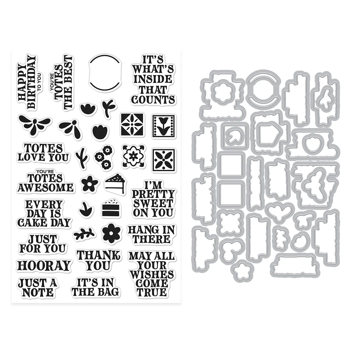 This Stamp & Cut includes 32 clear stamps and 31 coordinating metal dies.