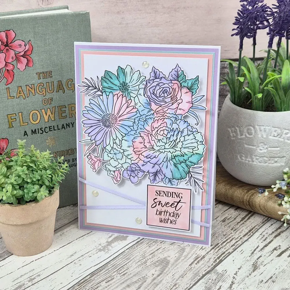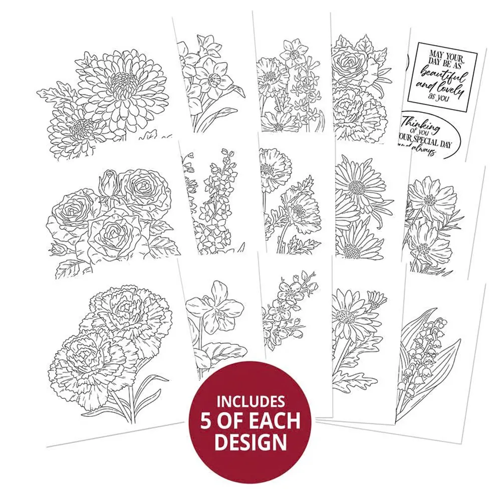 Colour each of the 12 birth month flowers along with two floral arrangements and complete your cards and projects with a greeting from the sentiment sheet. The 15 different designs are printed onto 150gsm Colour Me! Cardstock, ideal for use with Prism Alcohol Markers. The super smooth finish allows for seamless blending and the pages are enclosed in a pad for easy storage. With five of each design, you can colour each flower in a different colourway or try different colouring styles for something truly unique. The greetings on the sentiment sheet can be fussy cut or, for ease, can be cut using Moonstone nesting dies with the outer metal edge aligning with the sentiment outline shape. Sentiments can be coloured to match your coloured image ensuring everything works together beautifully.