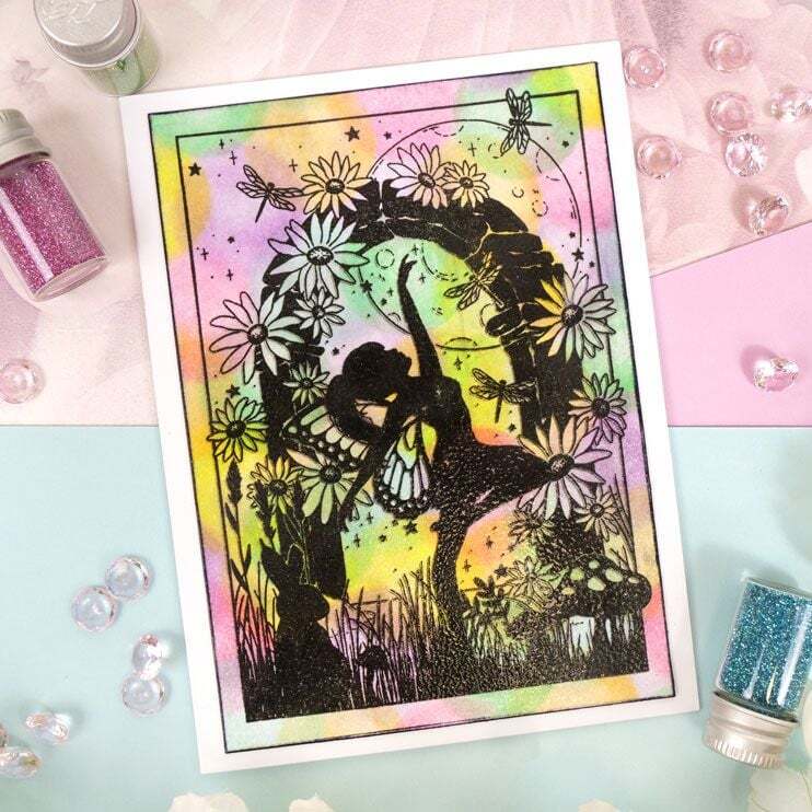 Only 2 Left!Create magical silhouetted centrepieces with the For the Love of Stamps - Dancing Fairy A6 stamp set. The large centrepiece stamp features a stunning fairy silhouette underneath a floral archway surrounded by dragonflies, mushrooms and a cute silhouette rabbit with the full moon shining in the background.