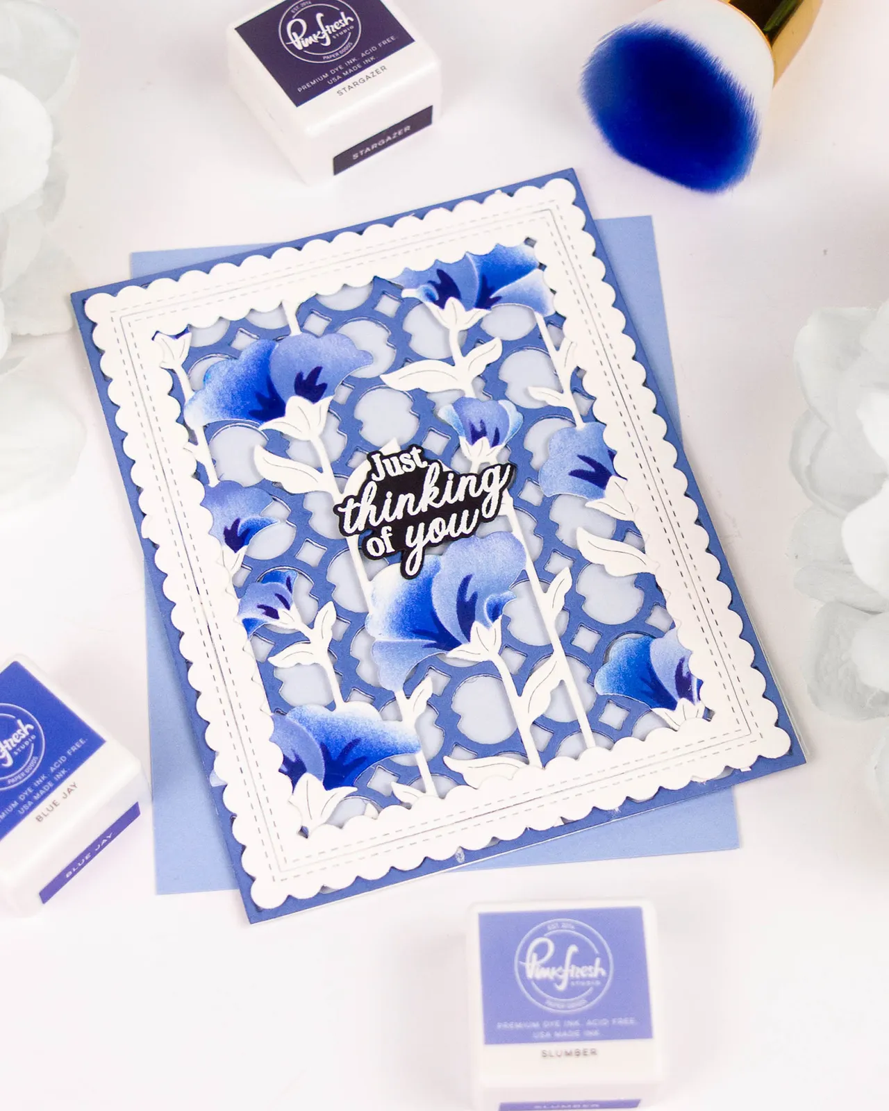 Create glowing backgrounds with the Lattice Glow coverplate die, designed by Inna Moreva. Designed to pair seamlessly with Dazzling Diamonds, this coverplate features a repeating circular lattice with diamond-shaped openings nested inside. Layer the two dies together for intricate looks, or use Lattice Glow alone for a softer, rounded pattern that still feels graphic and modern.
