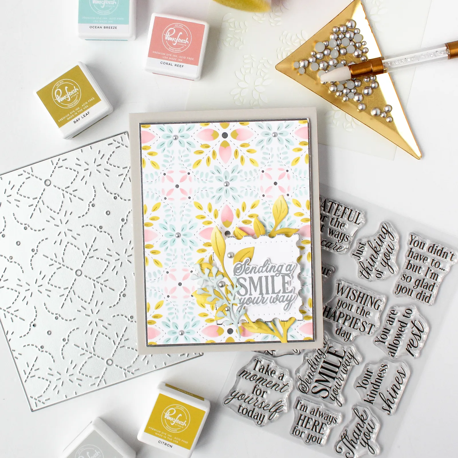 Add a stitched, quilt-inspired look to your backgrounds with the Petal Mosaic coverplate die, designed by Inna Moreva. The stitch lines mimic hand-sewn detail.