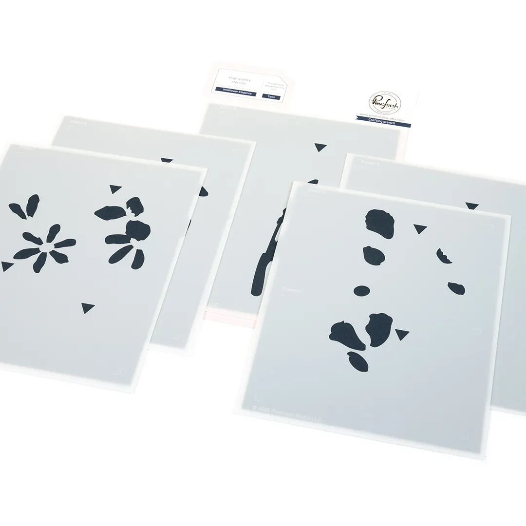 Bring bold color to your projects with the Wildflower Elegance layering stencil set. The design features flowers with overlapping areas for added depth. Blend inks in multiple shades to highlight dimension and movement.