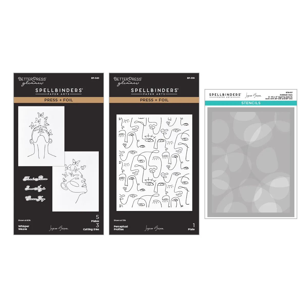 The All My Senses Faces Press + Foil Plates & Stencil Bundle includes two press plate sets, Perceptual Profiles and Whisper Weave, as well as the coordinating stencil, Ambient Aura. While the Perceptual Profiles plate creates a full card background of playful, modern faces in a simple line-drawn style, the Whisper Weave set features two elegant faces that bloom into sprays of butterflies. The Ambient Aura stencils up the wow factor of the plates, as well as offer tons of versatility for all your creations! Use the guidelines in the corners of the stencils to position the stencils to line up with the pressed images, providing wonderful pops of color to your creations. Or, use the stencil on it's own for fabulous modern backgrounds on any project.