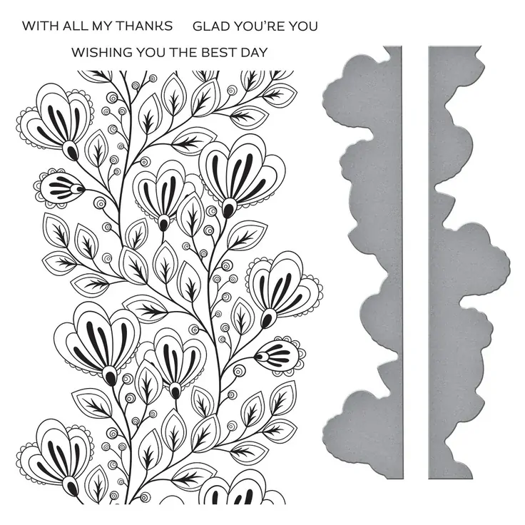 In StockFriendship Grows Press Plate & Die Set is the November 2025 release for the BetterPress Society, available exclusively to independent retailers. Flowers are blooming up your projects with this beautiful 4" x 5.5" plate. These stylized blossoms twine together with leaves and buds to make a stunning design perfect for all kinds of occasions. The set also includes two dies to cut along wither edge of the design, making this plate versatile to try many compositions. Cut along both edges to make a pop up band for the center of a card front, or cut only one side for a fresh look. You'll also get three sentiment strips, "WISHING YOU THE BEST DAY," "WITH ALL MY THANKS," and "GLAD YOU'RE YOU."