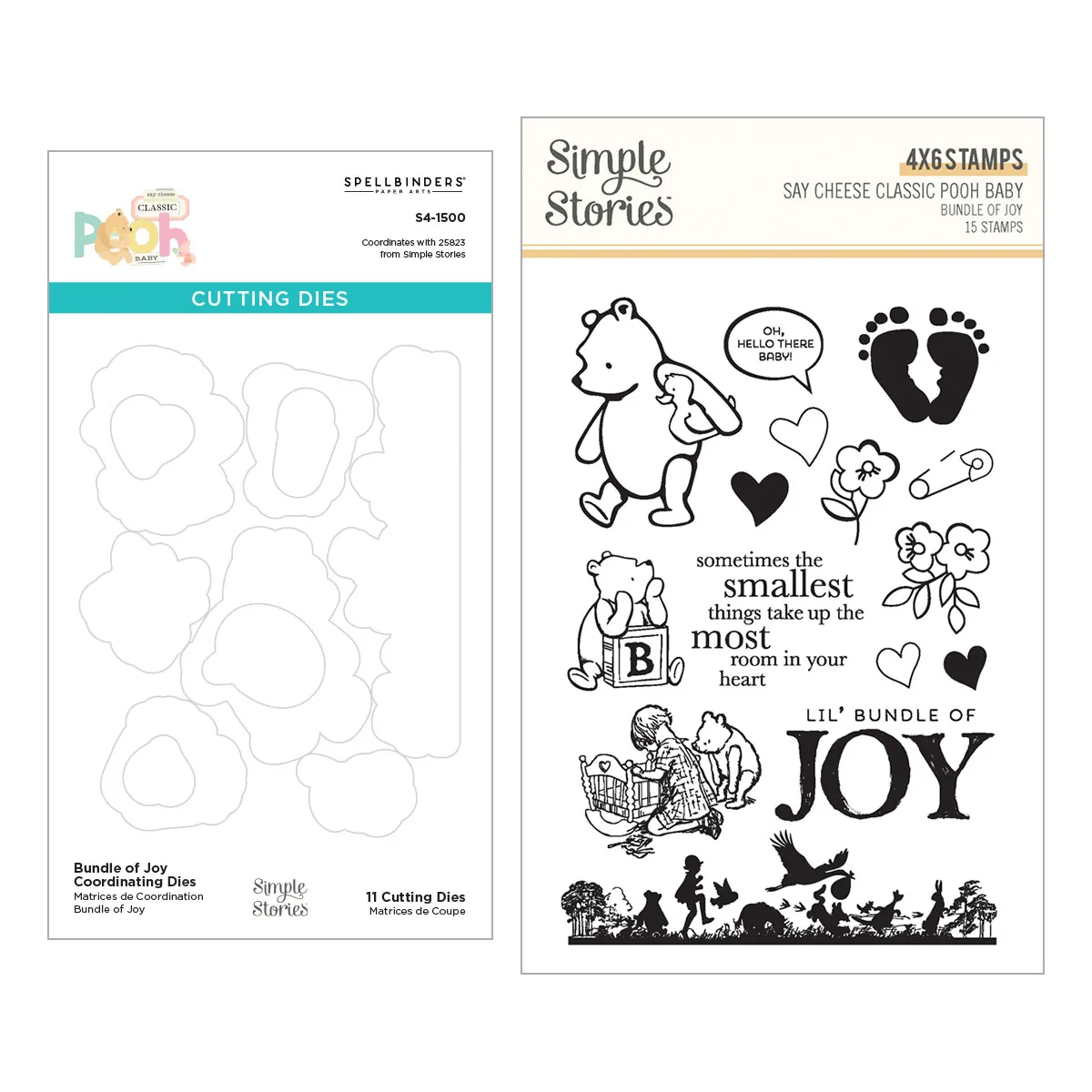 Bundle of Joy Stamp & Die Bundle is from the Say Cheese Classic Pooh Baby Collection with Simple Stories. The bundle includes SS25823 Bundle of Joy Clear Stamp Set and S4-1500 Bundle of Joy Coordinating Dies. Use them together to create wonderful baby cards, journal pages, scrapbook pages and more!