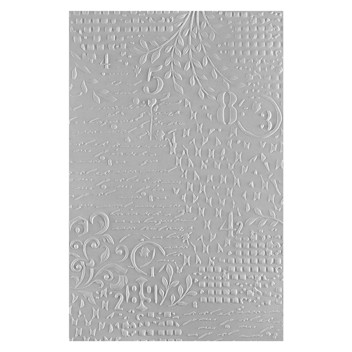 In StockDistress Mix 3D Embossing Folder is a 5.50 x 8.50-inch embossing folder. It has an amazing collage-inspired background filled with script font, numbers, squares and other wonderful patterns. What a fabulous backdrop to mix and match with the other sets in this collection!