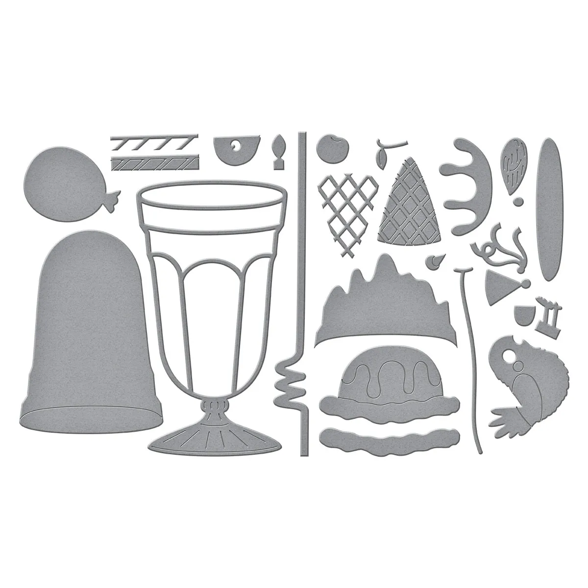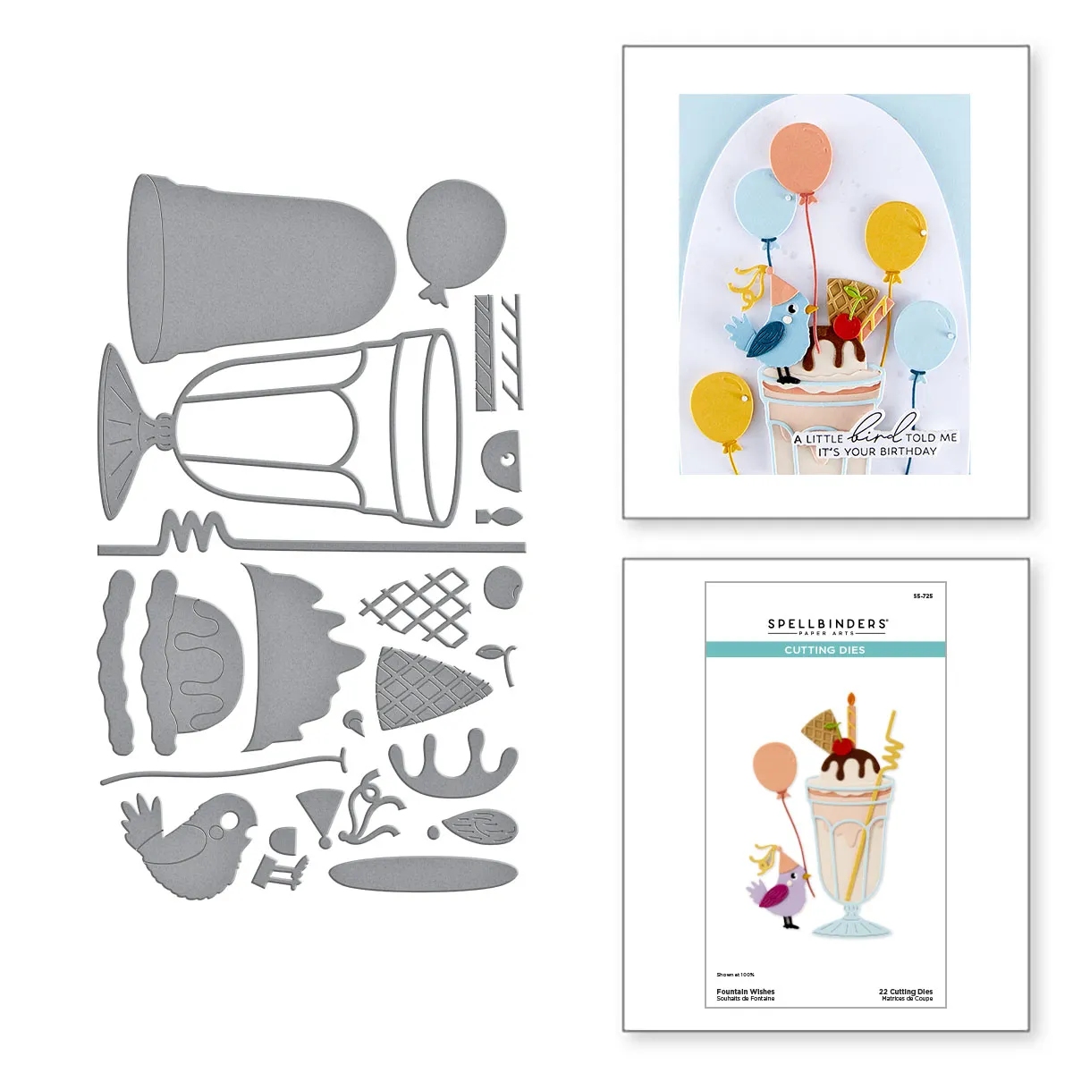 In StockFountain Wishes Etched Dies are from the Happier Hour Collection. When assembled, this set of 22 thin metal cutting dies creates sweet drinks based on a tall, footed fountain glass. Details include an ice cream scoop and drips to make it real! For extra fun, there are accents to add to set the vibe: straw, cherry, cookie, balloon, and more!