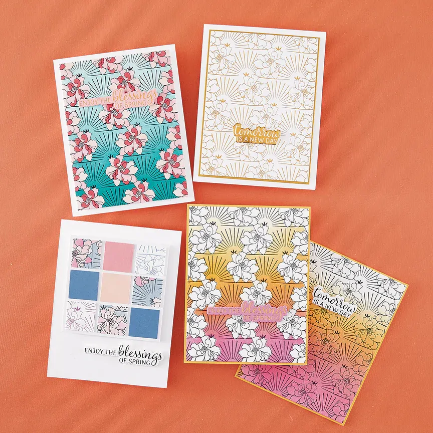 This set of four stencils come together to perfectly add pops of color and dimension to projects created with the Radiant Blooms plate. Three layers of the stencil color different petals, and the fourth allows overall color for the background.