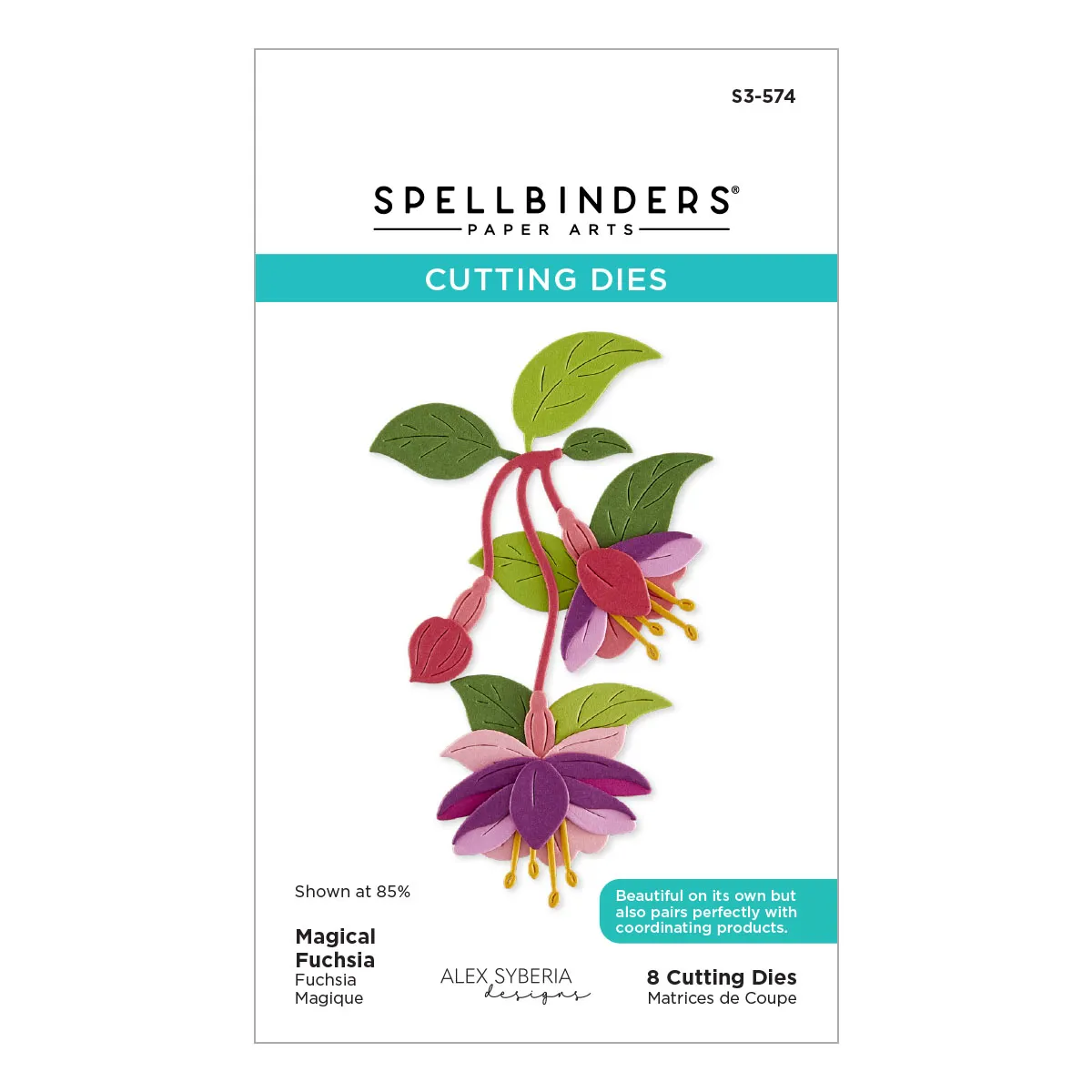 Magical Fuchsia Etched Dies are from the Magical Fuchsia Collection by Alex Syberia Designs. When assembled, this set of eight thin metal cutting dies creates a wonderful two fuchsia blossoms and one bud sprig that compliments the other sets in the collection.