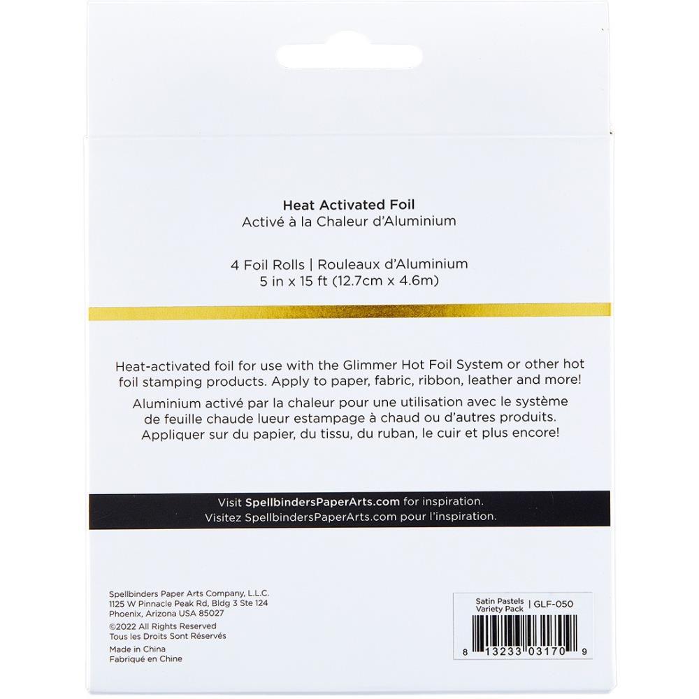 Sold OutGlimmer Hot Foil 4 Rolls - Satin Pastels Variety Pack comes in four different colors. Each roll is 15-foot with a width of 5-inches. Colors include Pastel Peach, Pastel Lavender, Pastel Mint, and Pastel Pink. Glimmer Hot Foil Foils add stunning and eye-catching foil designs to any project from paper crafts to mixed media and more! The foils are exclusively designed to be used with the Spellbinders Glimmer Hot Foil System. The foils are designed to work with the Glimmer Hot Foil System and is NOT compatible with laminating systems such as the Minc System. Approximate size: Each roll measures 5 inches x 15 feet/12.70 cm x 4.572 meters.
