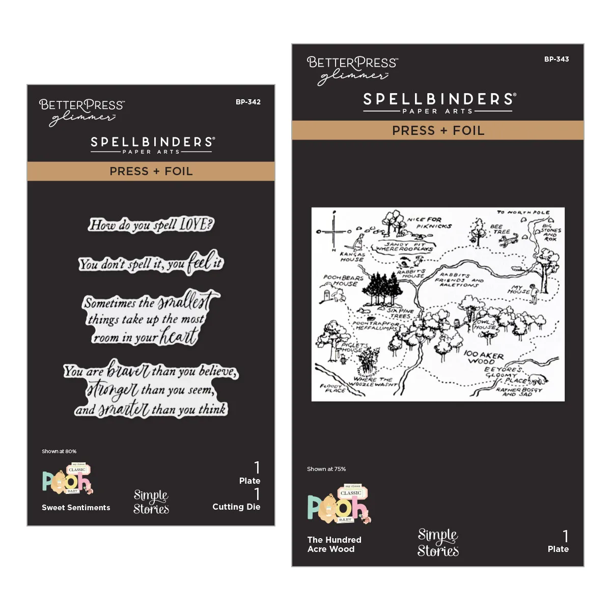 Say Cheese Classic Pooh Baby Press + Foil Plate & Die Bundle includes BP-342 Sweet Sentiments Press + Foil Plate & Die Set and BP-343 The Hundred Acre Wood Press + Foil Plate. Use them together to create stunning cards with the combination of a whimsical backdrop and a choice of seven encouraging sentiments.