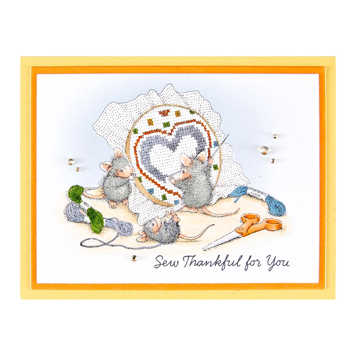 Stitched with Love Cling Rubber Stamp Set is from the House-Mouse Heart and Soul Collection. Muzzy, Amanda, and Monica make up a sewing circle to make an adorable heart embroidery creation. In addition to the focal point image, the set of five stamps includes four sentiments: Beautiful things come together one stitch at a time., Stitched with Love, To My Valentine, and Sew Thankful for You. The House-Mouse Designs is created and copyrighted by the talented Ellen Jareckie. It is a wonderful collaboration with Spellbinders, and we are excited to share warm and cozy moments in a series of designs with the Heart and Soul Collection!