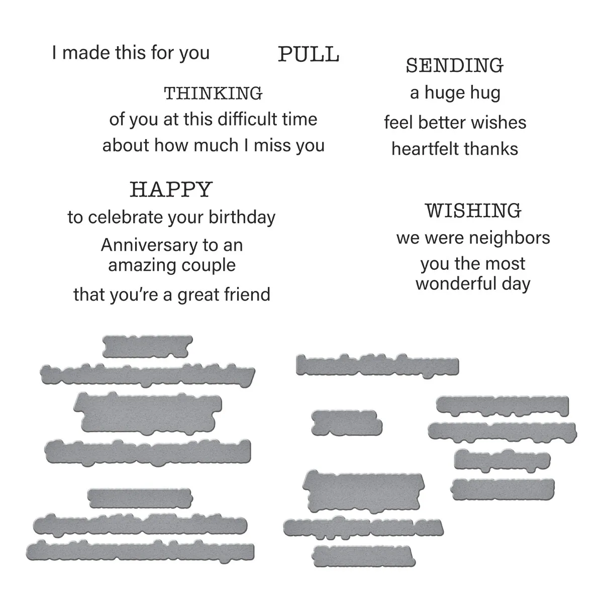 Tabbed In & Out Sentiments Clear Stamp & Die Set is from the Tabbed Classic Collection by Wendy Vecchi and is a set of six clear stamp of words and sentiments with its matching six thin metal cutting dies. Each uppercase ?main? words (SENDING, THINKING, HAPPY and WISHING) has supporting sentiments grouped together on a clear stamp. Stamp and then cut them all at once with the matching die for lots of sentiment options. Also, included are the word PULL and the sentiment ?I made this for you,? in both stamp and die format. This set works perfectly with S6-260 Essential Envelope Every Day Add-Ons Die Set.
