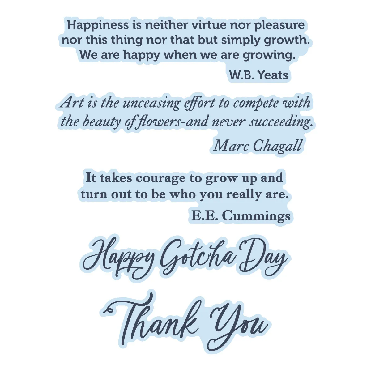 The Poet's Garden Sentiments Press + Foil Plate & Die Set are part of the Poet's Garden Collection by Susan Tierney-Cockburn. When the five plates are letterpressed and/or foiled, you get three wonderful poems from three popular poets (W.B. Yeats, Marc Chagall and E.E. Cummings) and two sentiments. There are also five coordinating thin metal cutting dies that perfectly cut them out.
