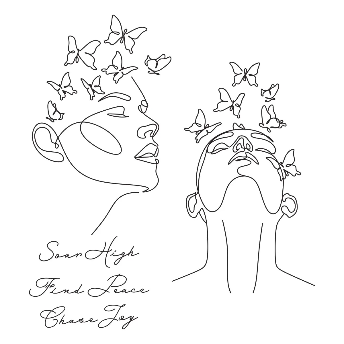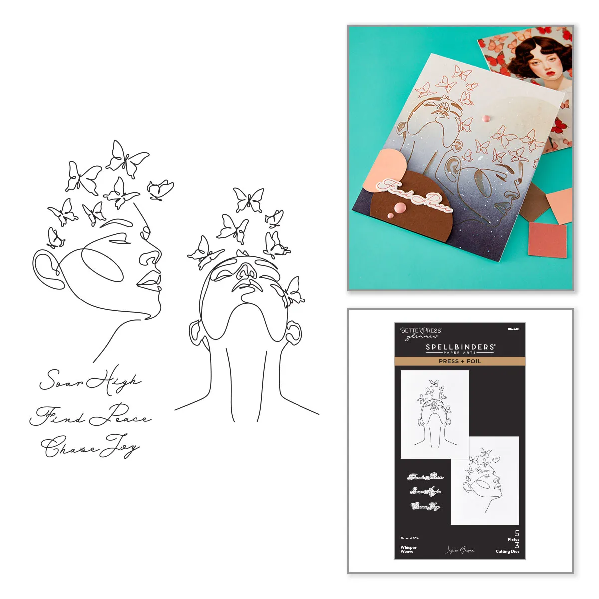Whisper Weave Press + Foil Plate & Die Set is from the All My Senses Collection by Jaycee Gaspar. In the set of five plates and three thin metal cutting dies, there are two poses with one facing up and the other facing sideways, each with butterflies fluttering in the hair. The other three plates are sentiments with each having a coordinating die to cut them out: Soar High, Choose Joy and Find Peace.