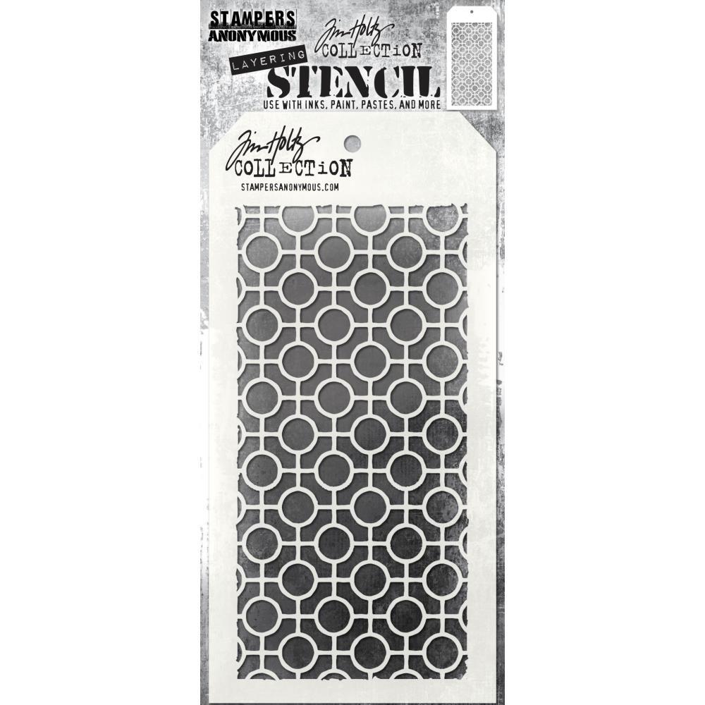 Tim Holtz Layering Stencil: Linked Circles There is no doubt the versatility of stencils make them the latest must have tools. Tim Holtz has designed these stencils so that they are a little more imperfect as a way to add texture and imagery. Use these stencils to layer inks, paints, stains - so many creative ways to use them to enhance your projects. Tag-shaped stencil measures 4 1/8" x 8 1/2", with a convenient hole in top to attach with a Cable Binder Ring