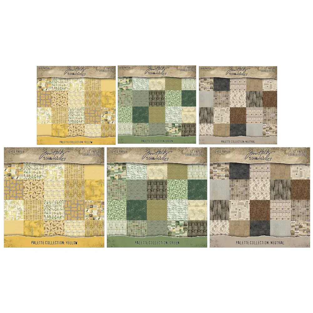 This bundle contains all six Palette Collection paper pads released in March 2026 as part of the second collection. 12x12" and 8x8" in NEUTRAL timeless, layered, and grounded in vintage design. This curated collection explores soft creams, warm tans, weathered grays, and deep charcoals, creating a versatile foundation for storytelling. YELLOWS warm, mellow, and rich with vintage character. Inspired by sun-faded ephemera and timeworn details, this curated collection explores golden yellows, soft ochres, and muted mustard tones. GREENS earthy, organic, and rooted in nature-inspired vintage style. This curated collection explores mossy greens, soft sages, deep forest tones, and weathered olives.